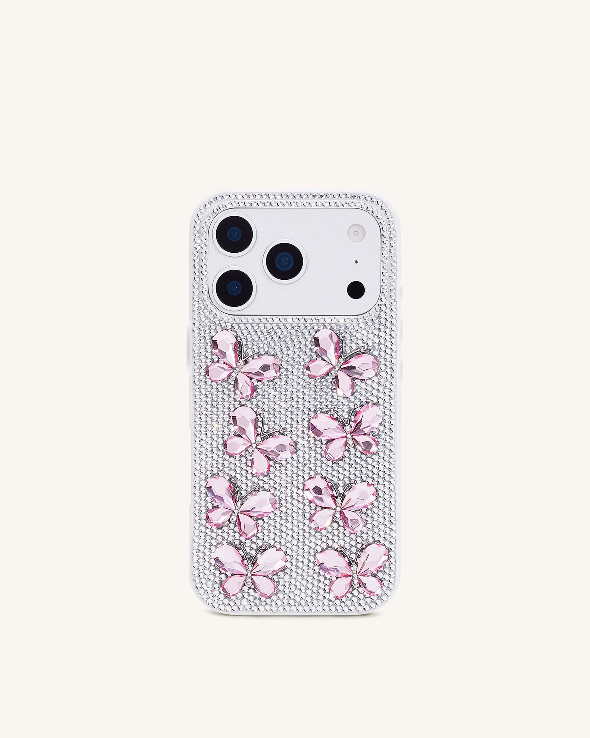 Diese Handyhülle verfügt über ein weißes Kristalldesign, verziert mit 3D-Schmetterlingen aus rosa Kristall. Vollständig mit funkelnden Elementen besetzt, bietet sie einen grundlegenden Schutz, eine verbesserte Griffigkeit und dient zugleich als stilvolles, dekoratives Accessoire.