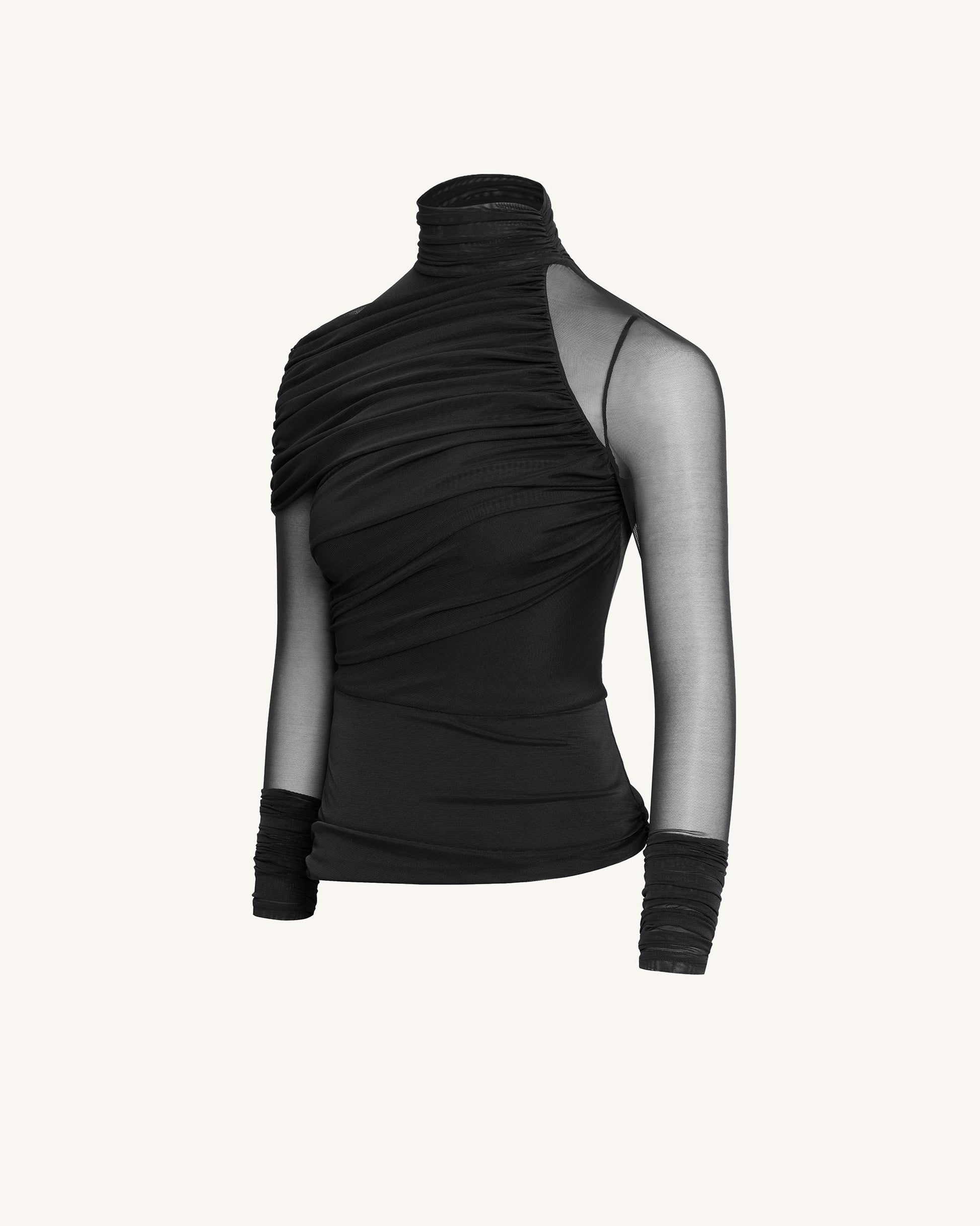 Ella Transparente Rüschen-Rollkragenbluse - Schwarz