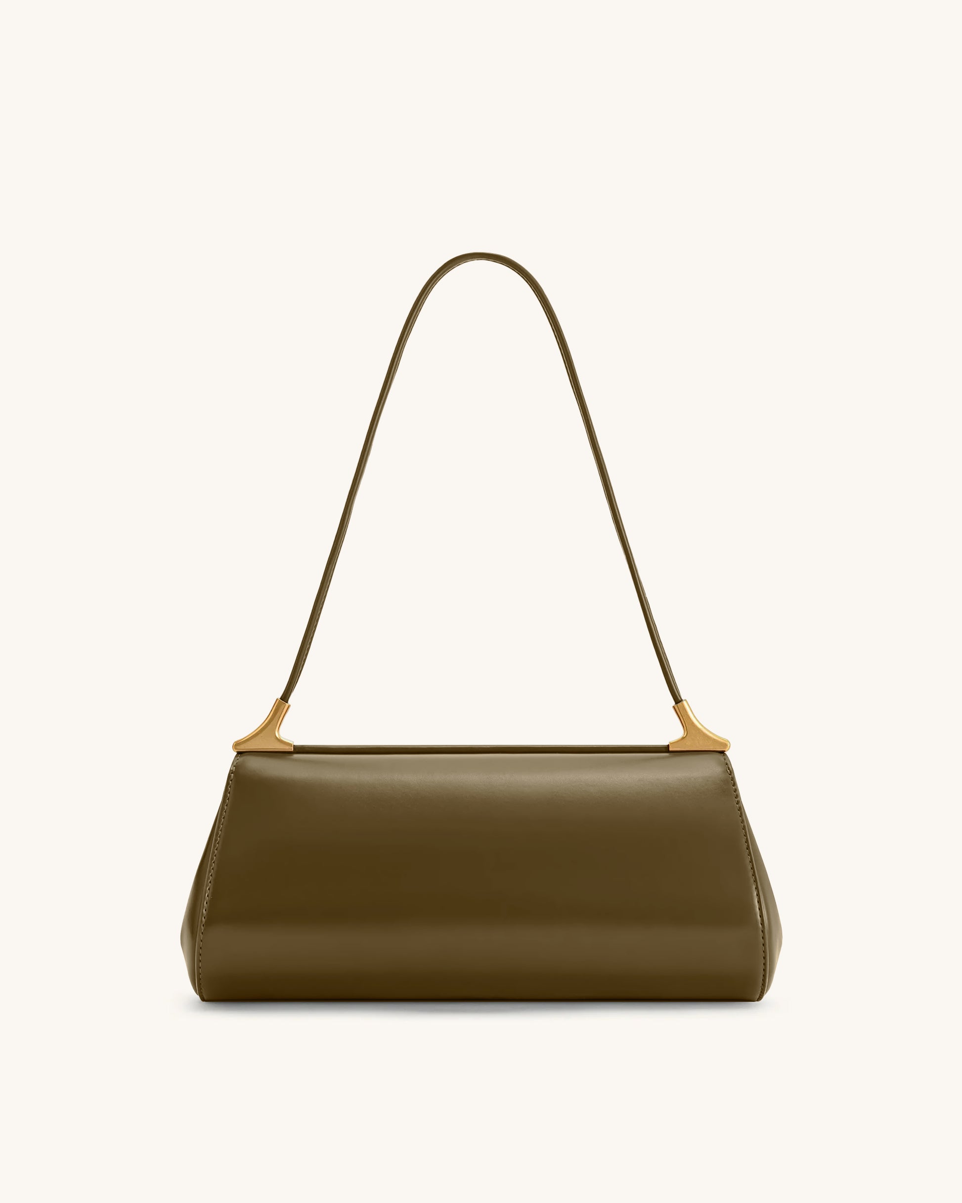 Poliert, klar und modern. Mit goldenen Hardware-Elementen und einem klassischen einzelnen Schulterriemen. Genügend Platz für Essentials und ein großes Telefon.