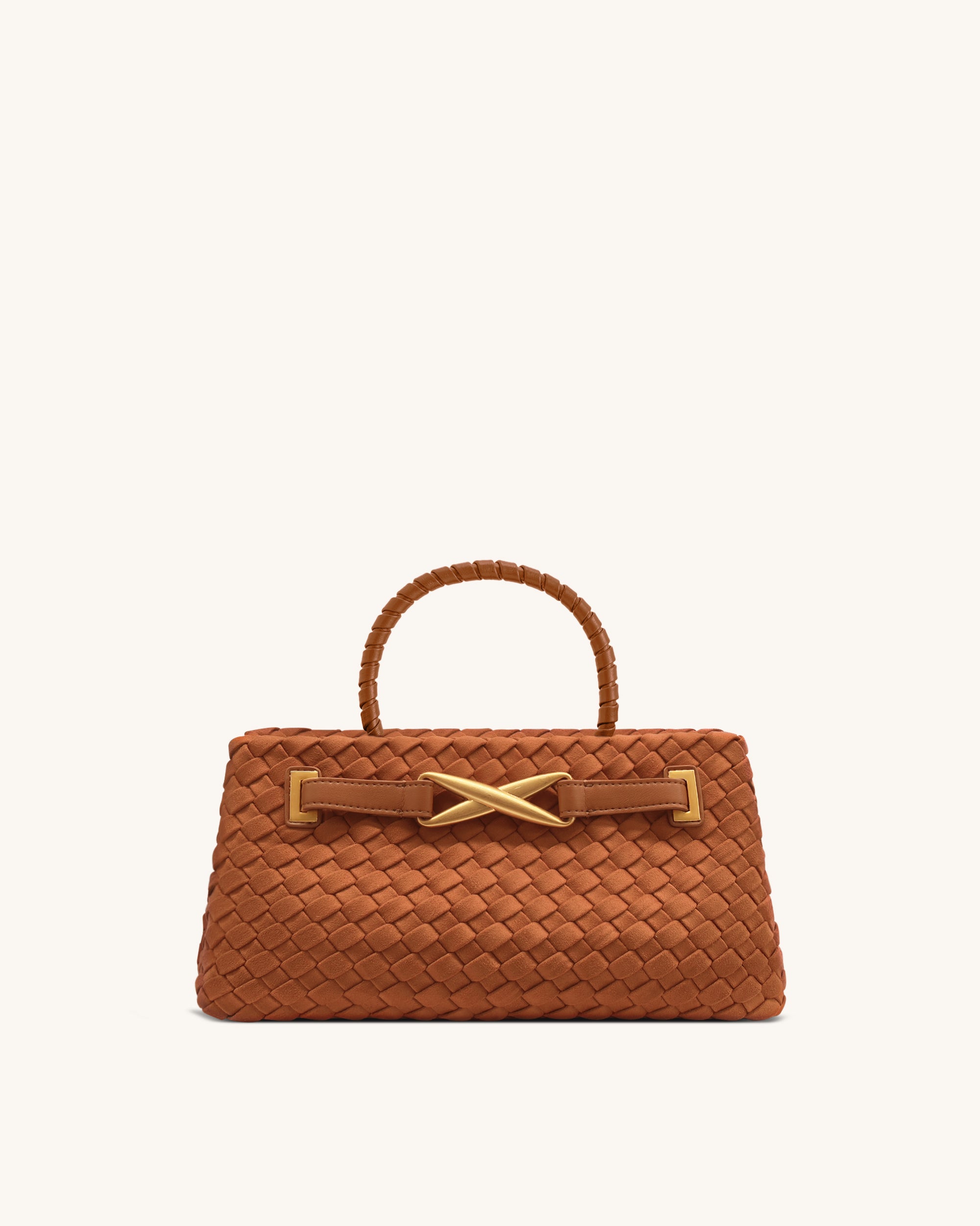 Diese strukturierte Henkelhandtasche besticht durch ihren satten Karamellton, eine handgewebte Textur und elegante goldfarbene Beschläge. Das X-förmige Schnallendetail verleiht der klassischen Silhouette eine moderne Note und macht sie zu einer stilvollen Wahl für den Alltag ebenso wie für formelle Anlässe.