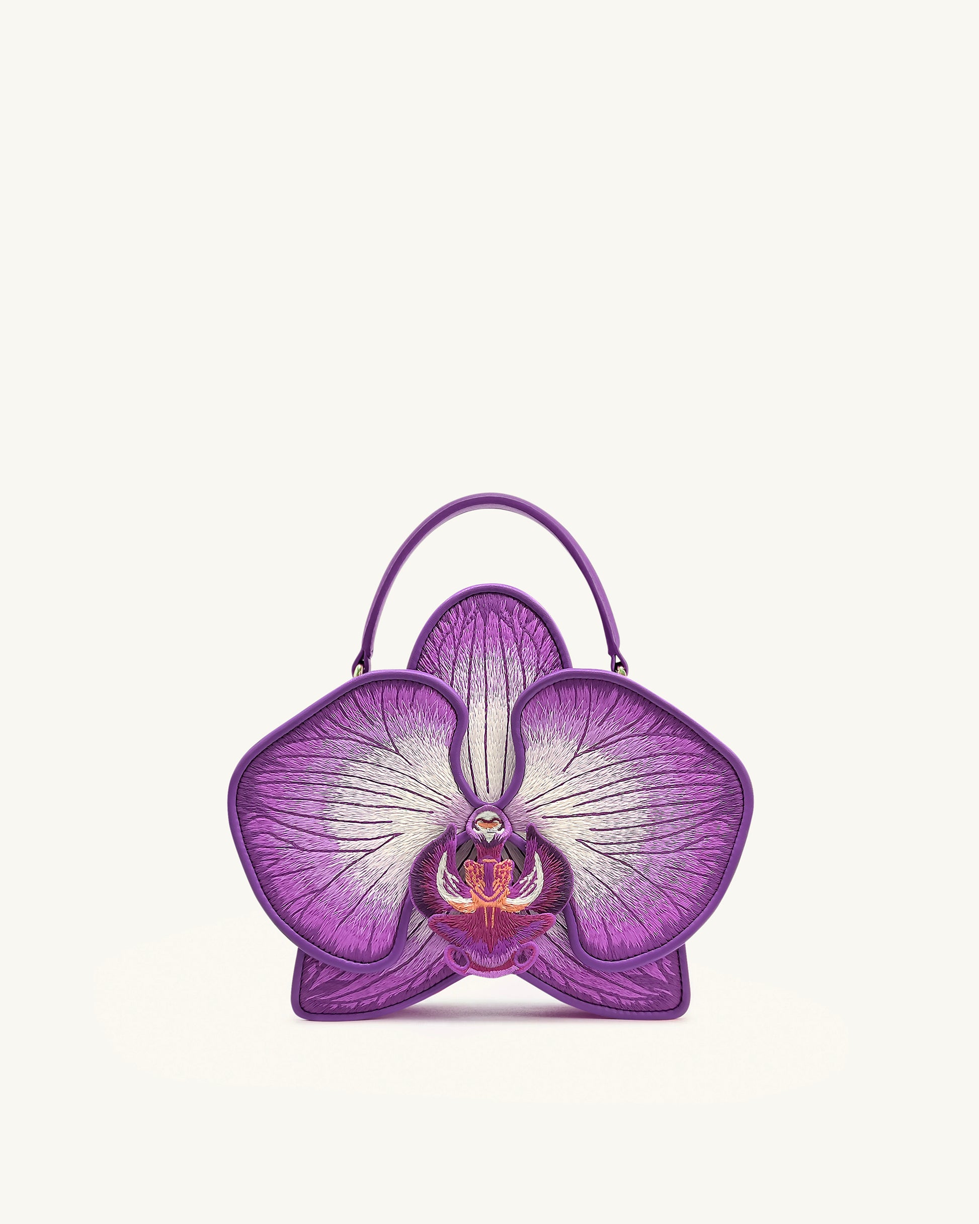Diese Handtasche ist geformt wie eine blühende Orchidee in lebendigem Lila, mit aufwendiger Stickerei, die die zarten Details der Blütenblätter einfängt. Mit ihrem strukturierten oberen Griff vereint sie künstlerisches Design und Alltagstauglichkeit und ist ein auffälliges Statement-Accessoire.