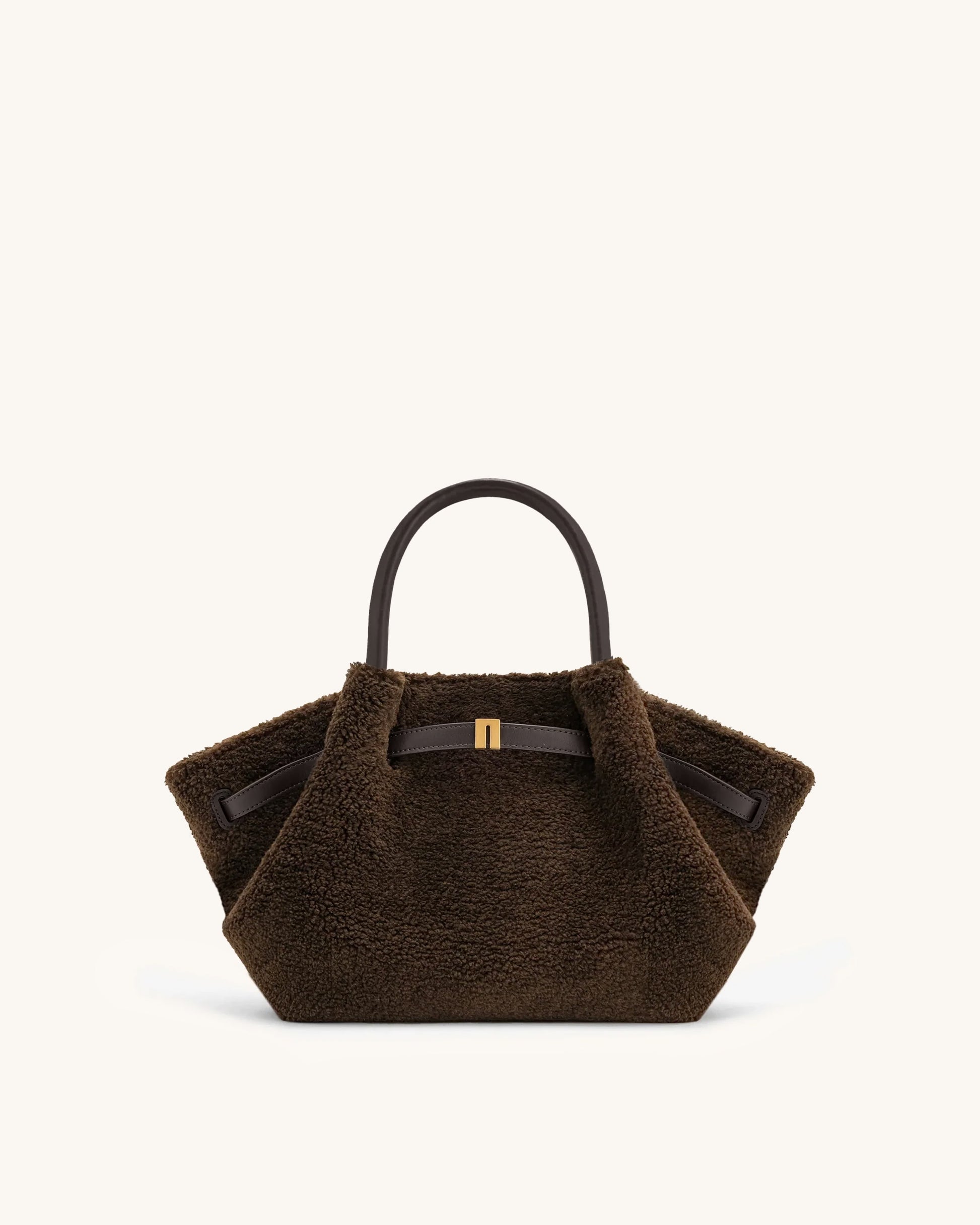 Diese gemütliche Tragetasche besticht durch eine skulpturale Trapezform und eine weiche, dunkelbraune Shearling-Optik. Abgerundet mit eleganten, lederähnlichen Griffen und goldfarbenen Details ist sie der perfekte Begleiter für kalte Tage, der Wärme und Stil in deinen Alltag bringt.