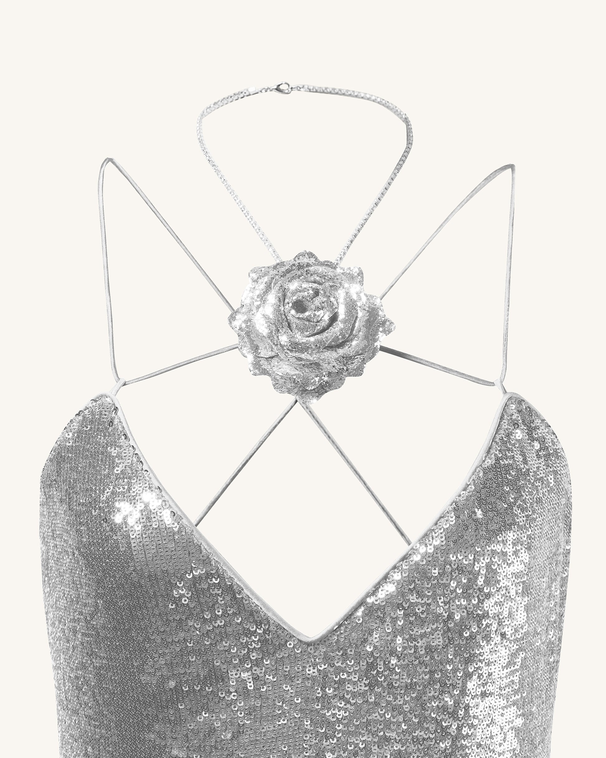 Heisey Silbernes Pailletten-Rosetten-Maxikleid - Silber