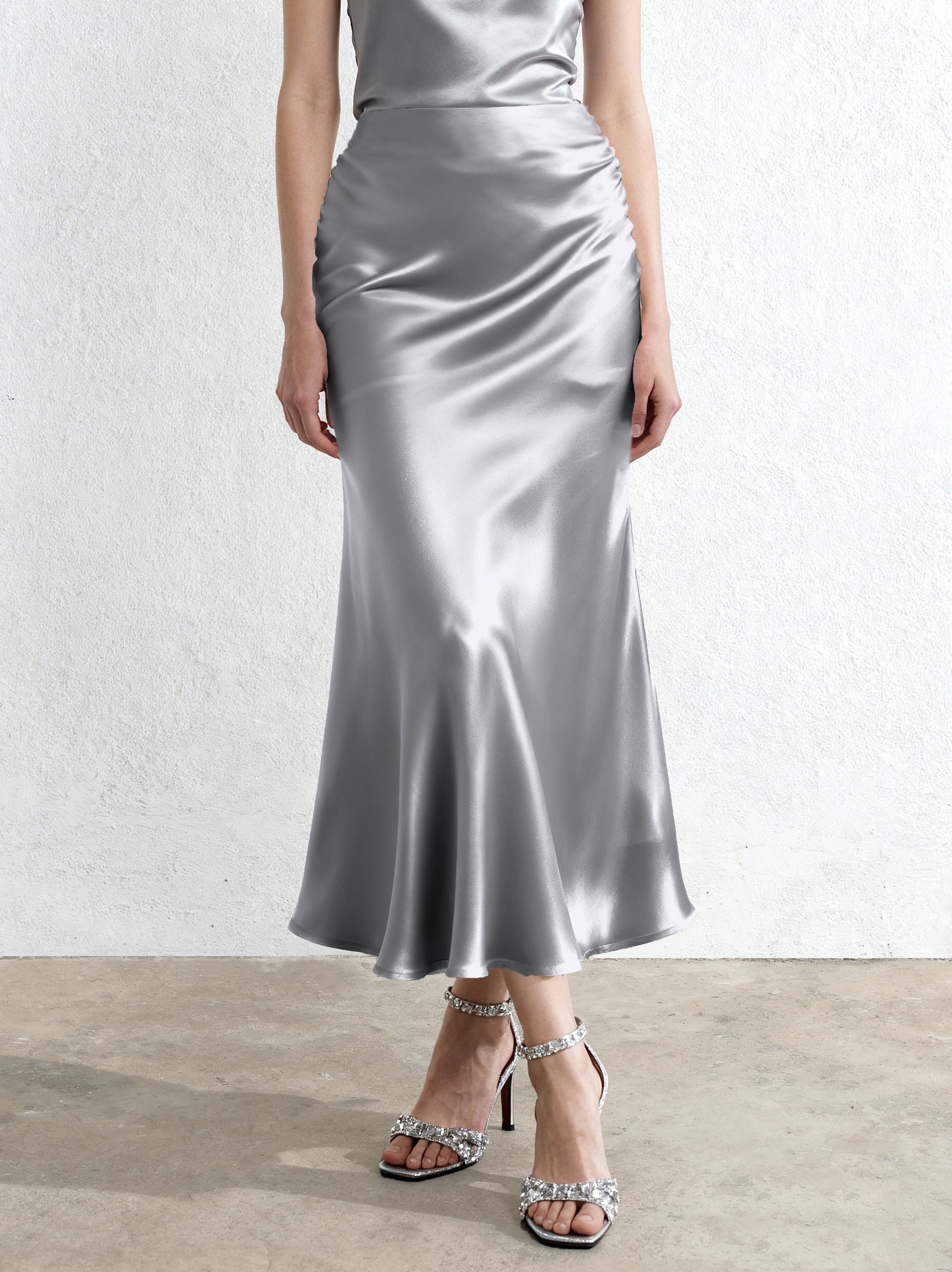 Fließender Satin Meerjungfrau-Maxi-Rock – Silber