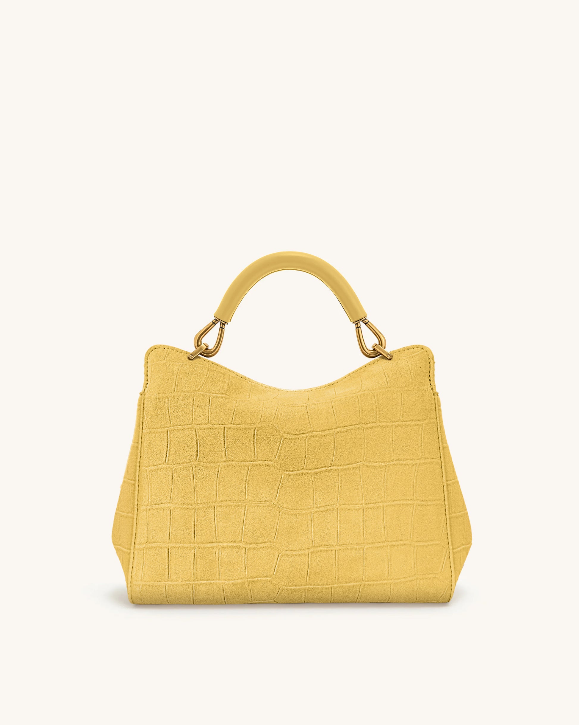 Diese auffällige Handtasche mit Obergriff besticht durch eine weiche Wildlederoptik mit Krokoprägung in warmem Gelb. Abgerundet mit einem goldfarbenen Drehverschluss, einem strukturierten Griff und einem abnehmbaren Crossbody-Riemen vereint sie vintage Charme mit moderner Vielseitigkeit – perfekt, um alltägliche Outfits aufzuwerten.
