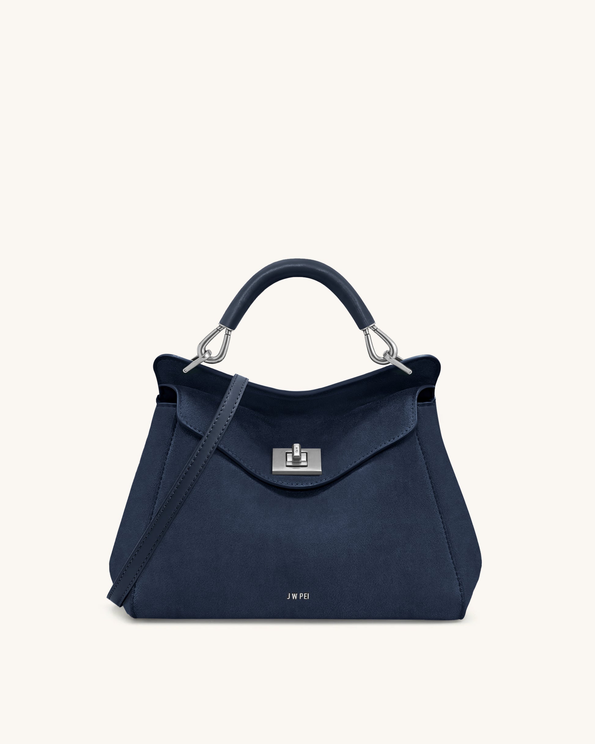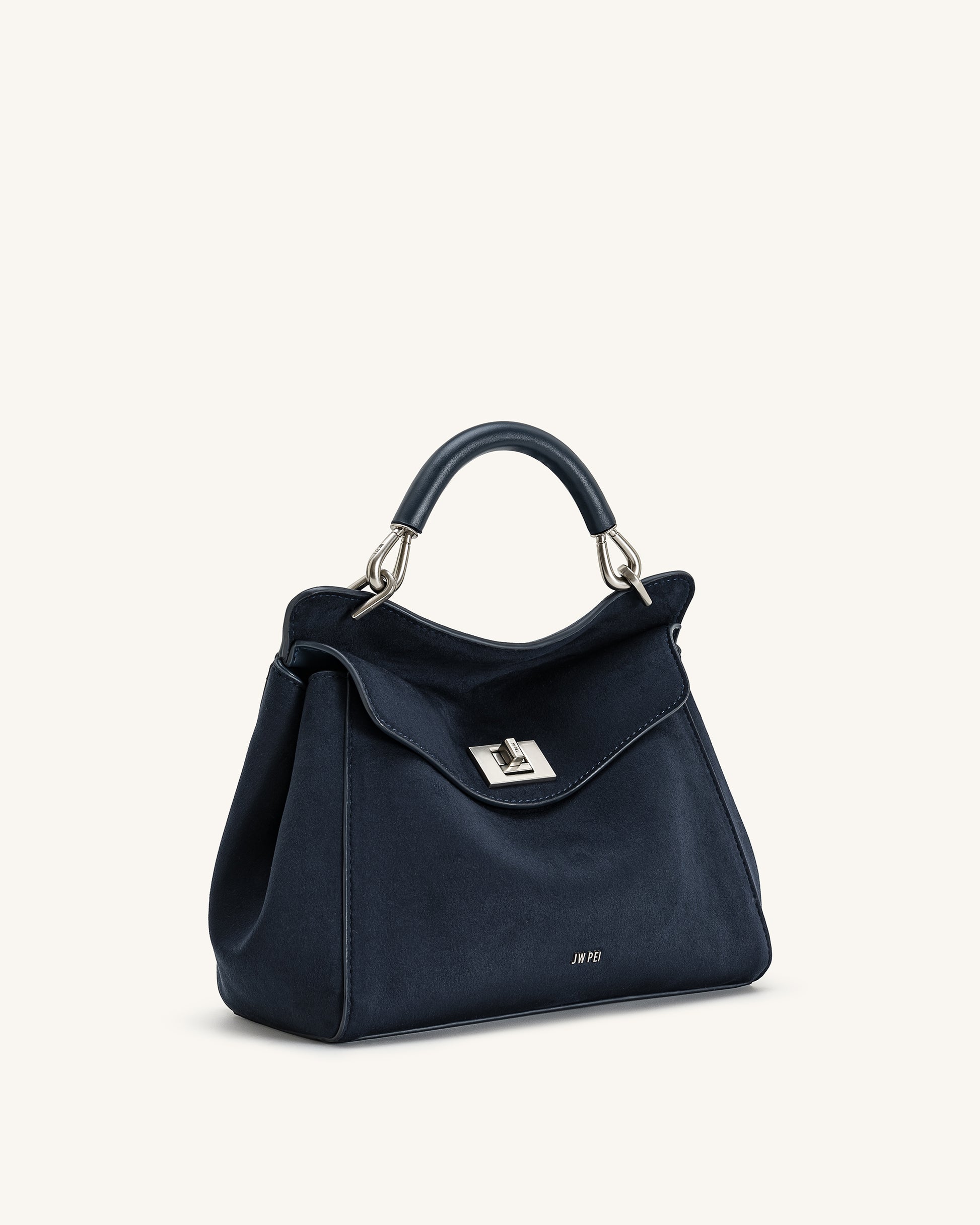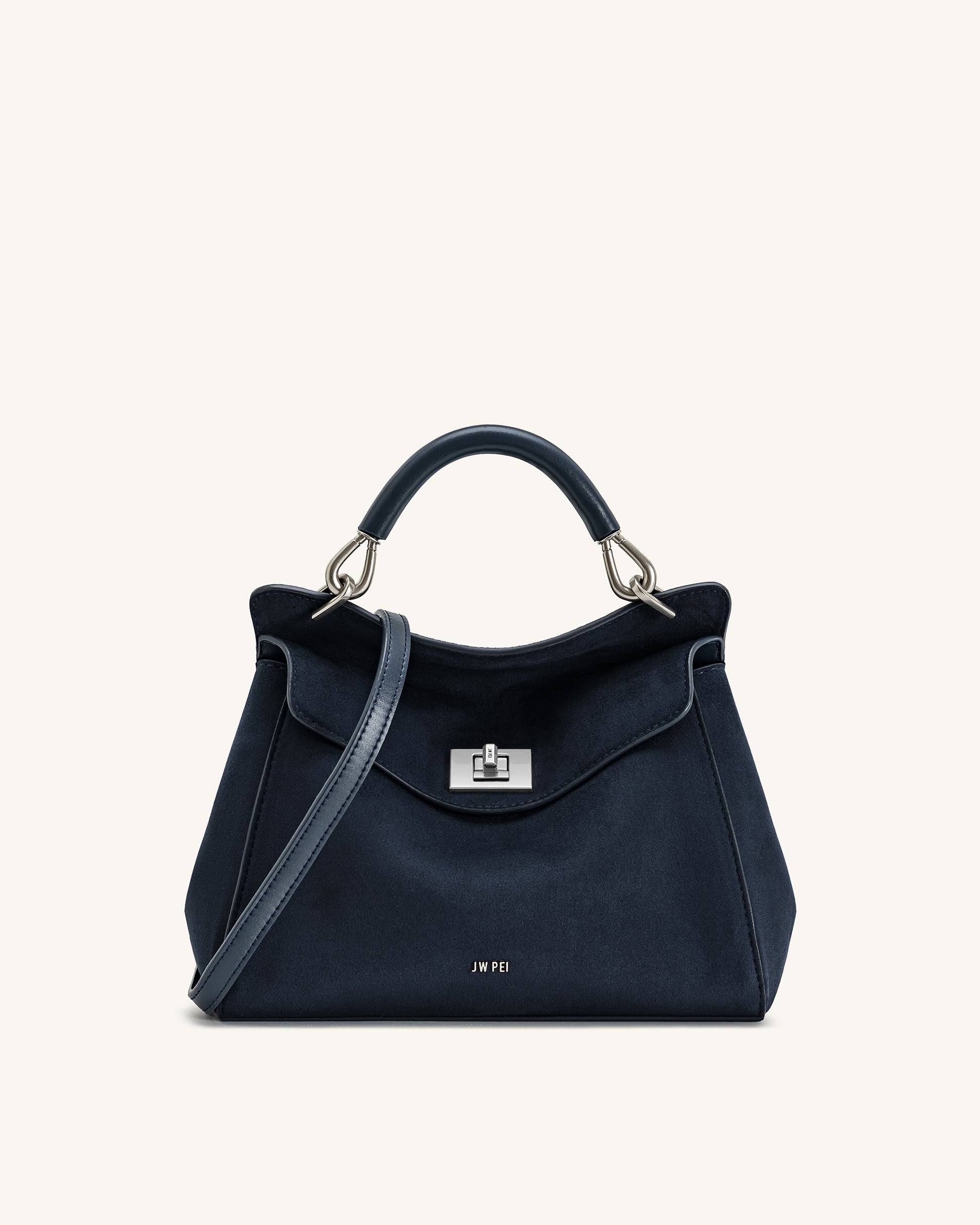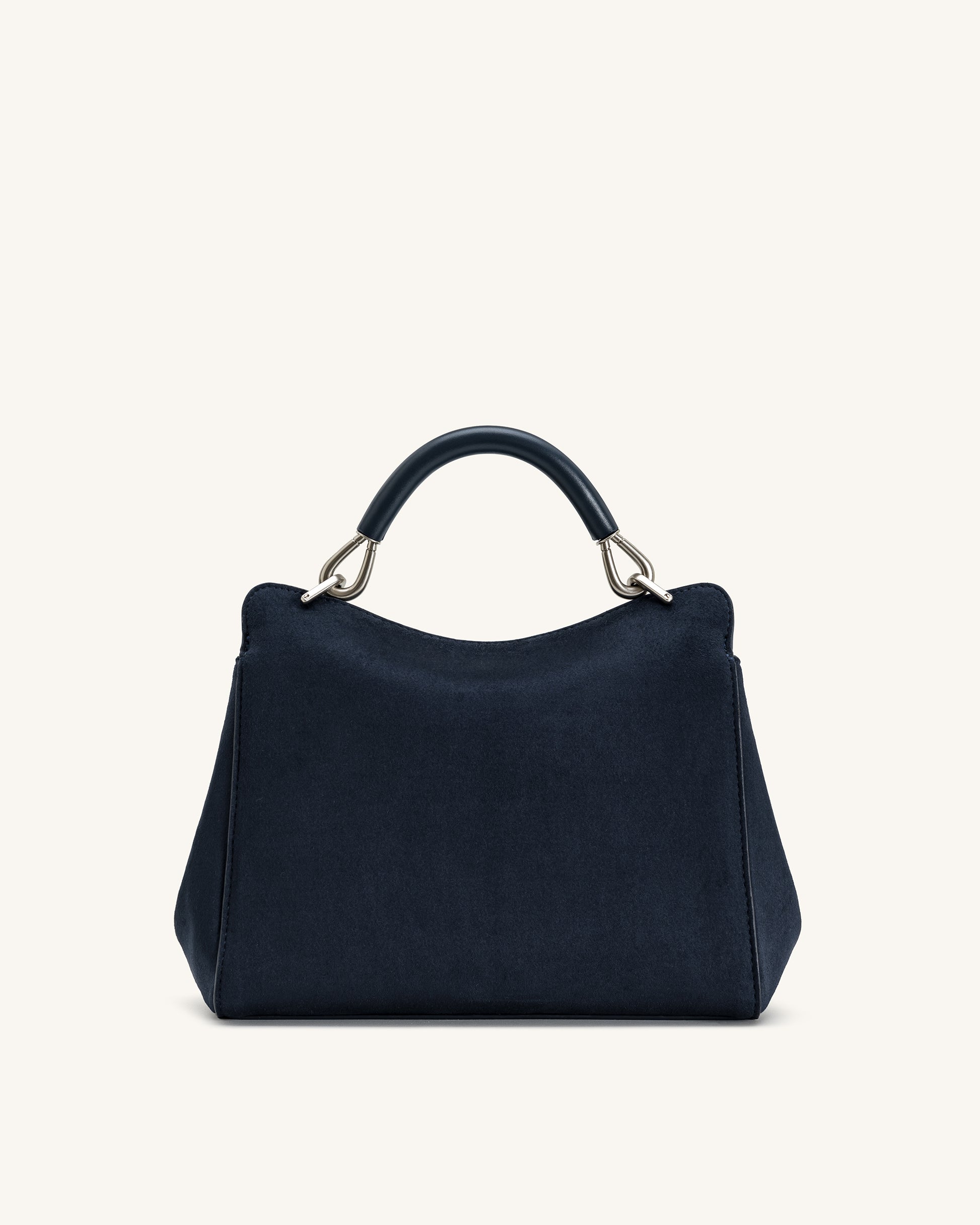 Diese elegante Handtasche mit Obergriff in klassischem Navyblau besticht durch eine weiche Wildlederoptik und einen schlanken silberfarbenen Drehverschluss. Ausgestattet mit einem strukturierten Griff und einem abnehmbaren Crossbody-Riemen verbindet sie zeitlose Eleganz mit praktischer Alltagstauglichkeit – perfekt für Arbeit, Meetings oder Stadtbummel.