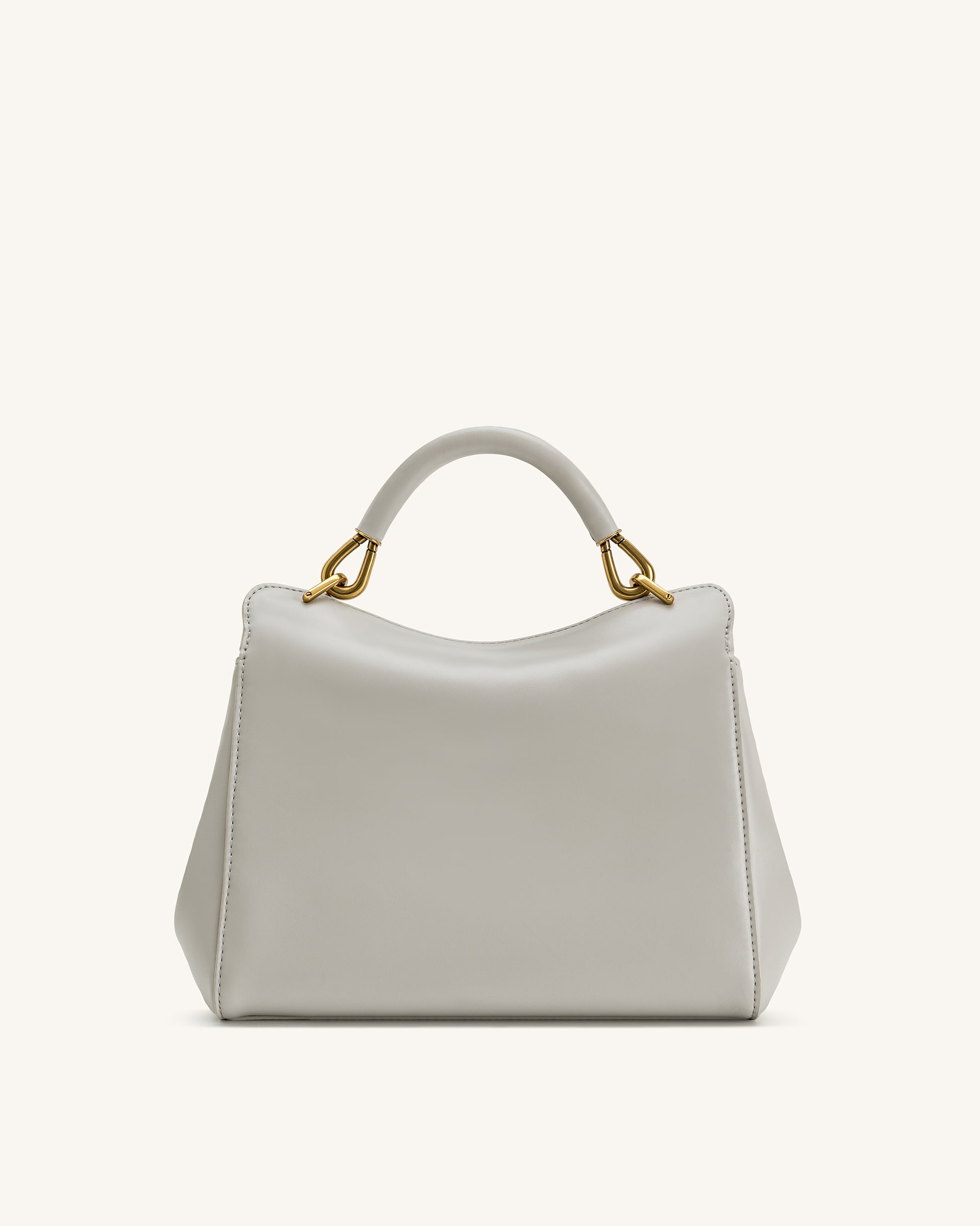 Diese elegante Handtasche mit Obergriff in einem hellgrauen Ton besticht durch eine glatte, polierte Oberfläche und eine sanft strukturierte Silhouette. Abgerundet mit einem goldfarbenen Drehverschluss, einem stabilen Griff und einem abnehmbaren Crossbody-Riemen ist sie ein vielseitiges Accessoire, das sowohl lässige als auch elegante Looks ergänzt.