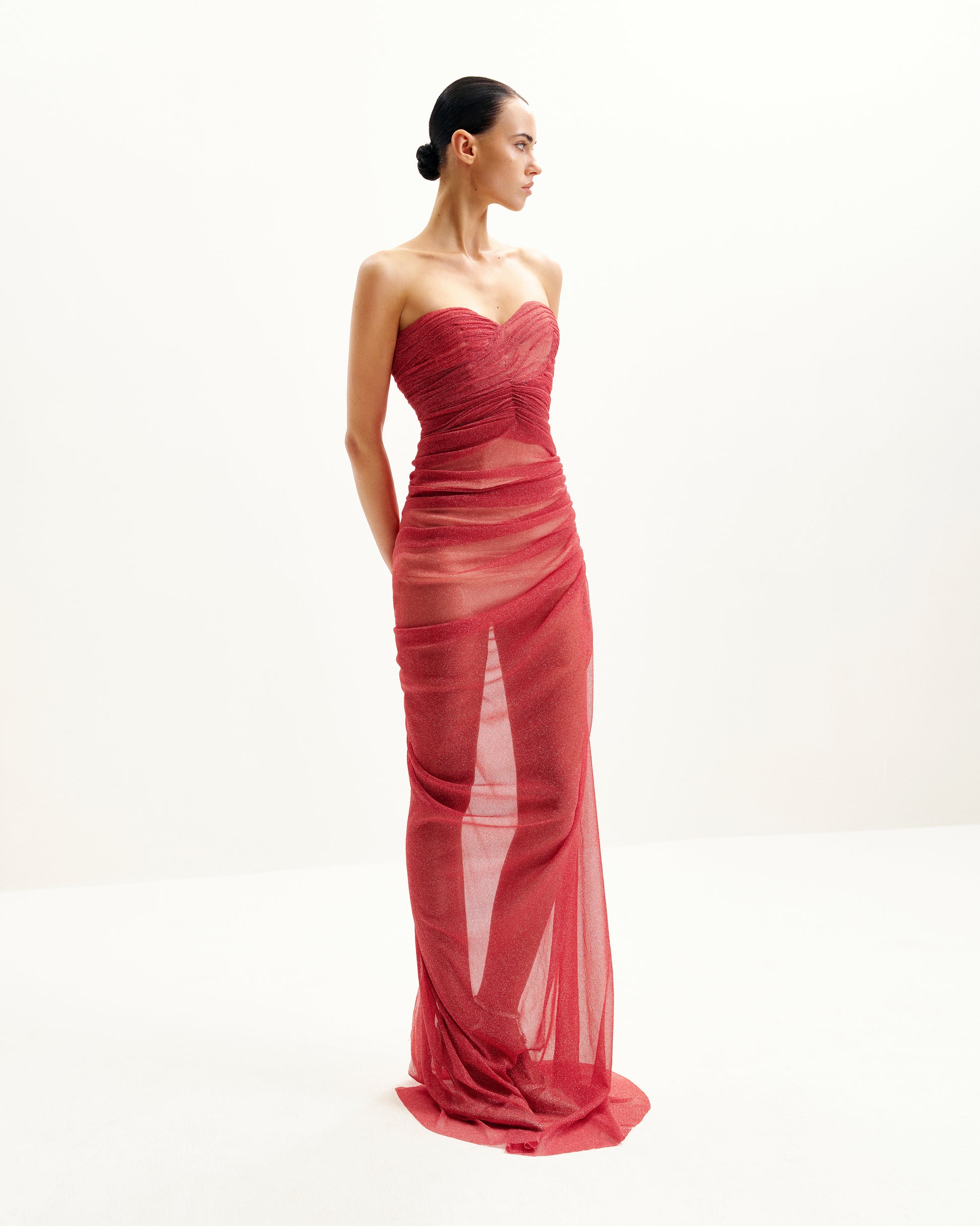 Mia Trägerloses Transparente Glitzerkleid - Scharlachrot