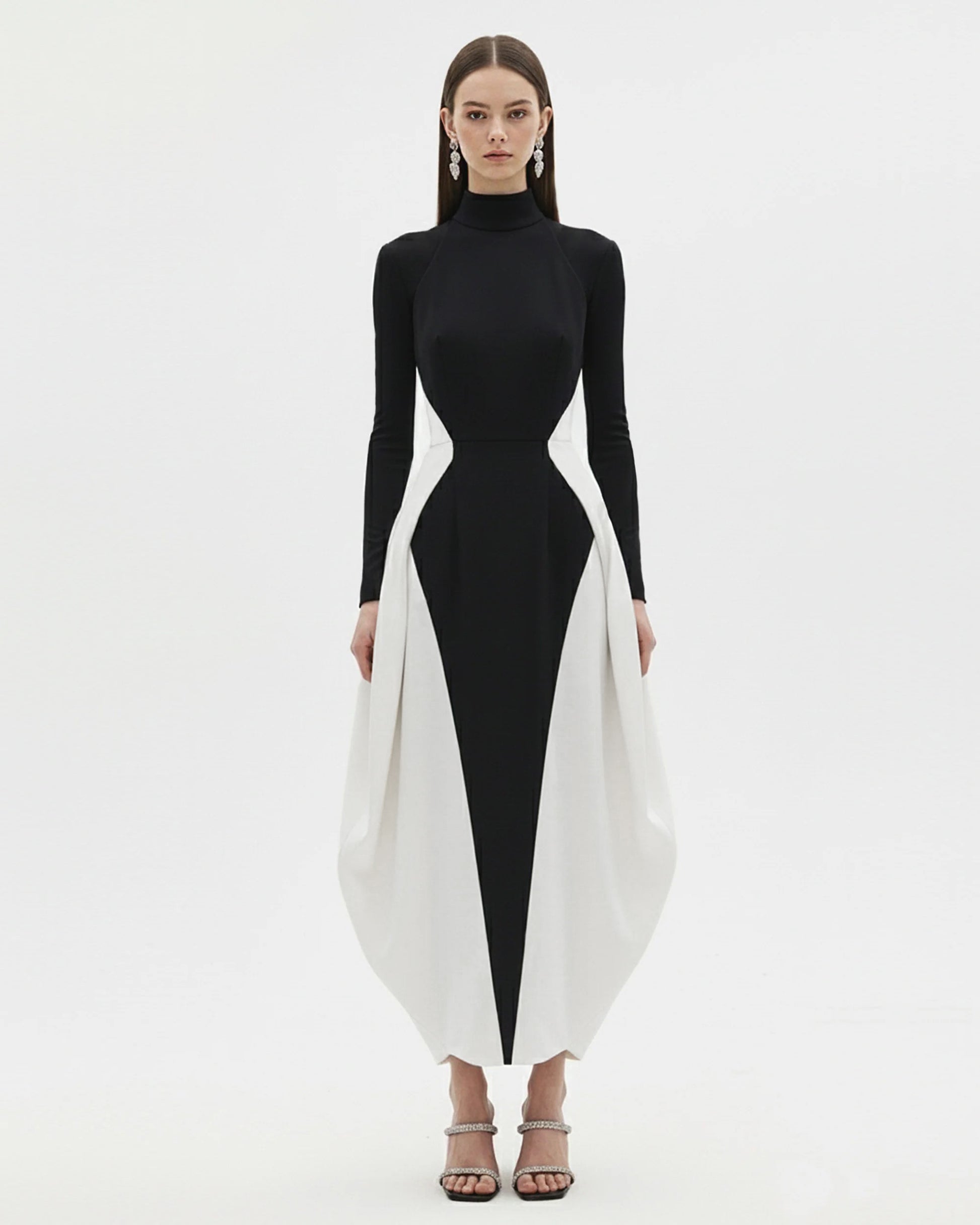 Monochromes Paneel-Langarm-Maxikleid - Schwarz