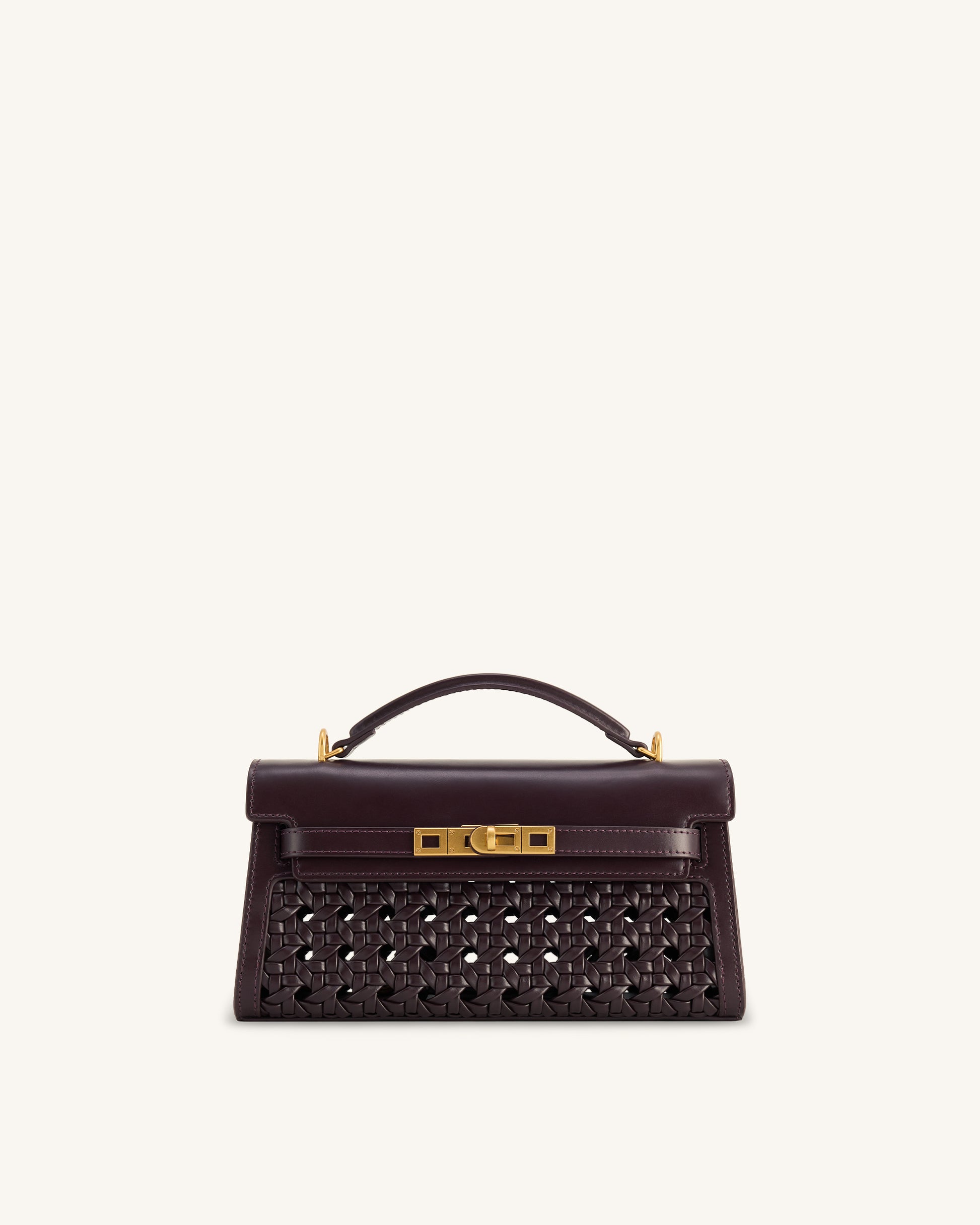 Strukturierte und moderne Tasche aus geflochtenem veganem Leder. Der satte Braunton und die goldfarbenen Beschläge verleihen Eleganz. Kompakt, aber praktisch für das Nötigste. Mit oberem Griff und verstellbarem Riemen für vielseitige Tragemöglichkeiten.