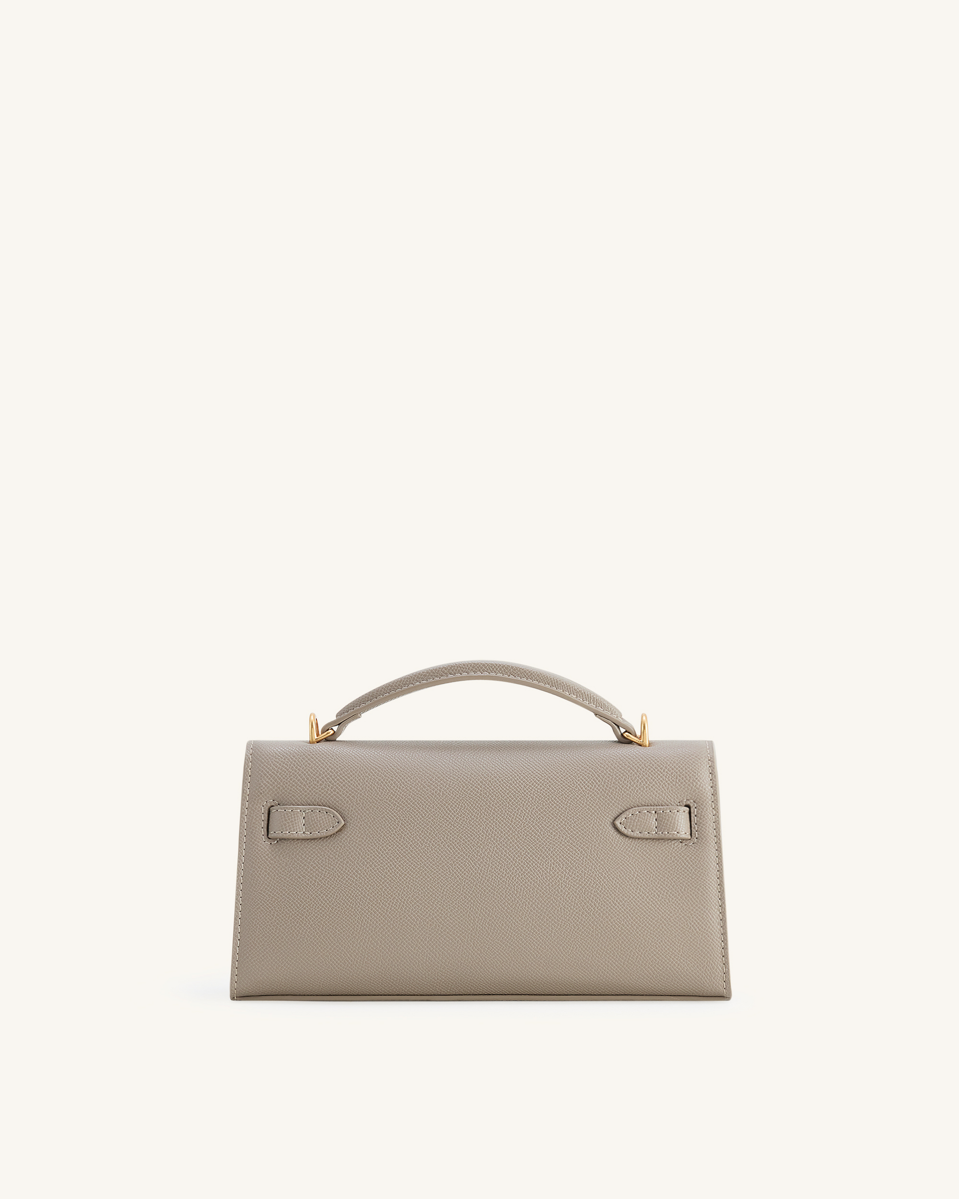 Strukturiert, modern und vielseitig. Neutrale Taupe-Farbe mit goldfarbener Hardware. Ideal zum Tragen in der Hand oder als Umhängetasche.