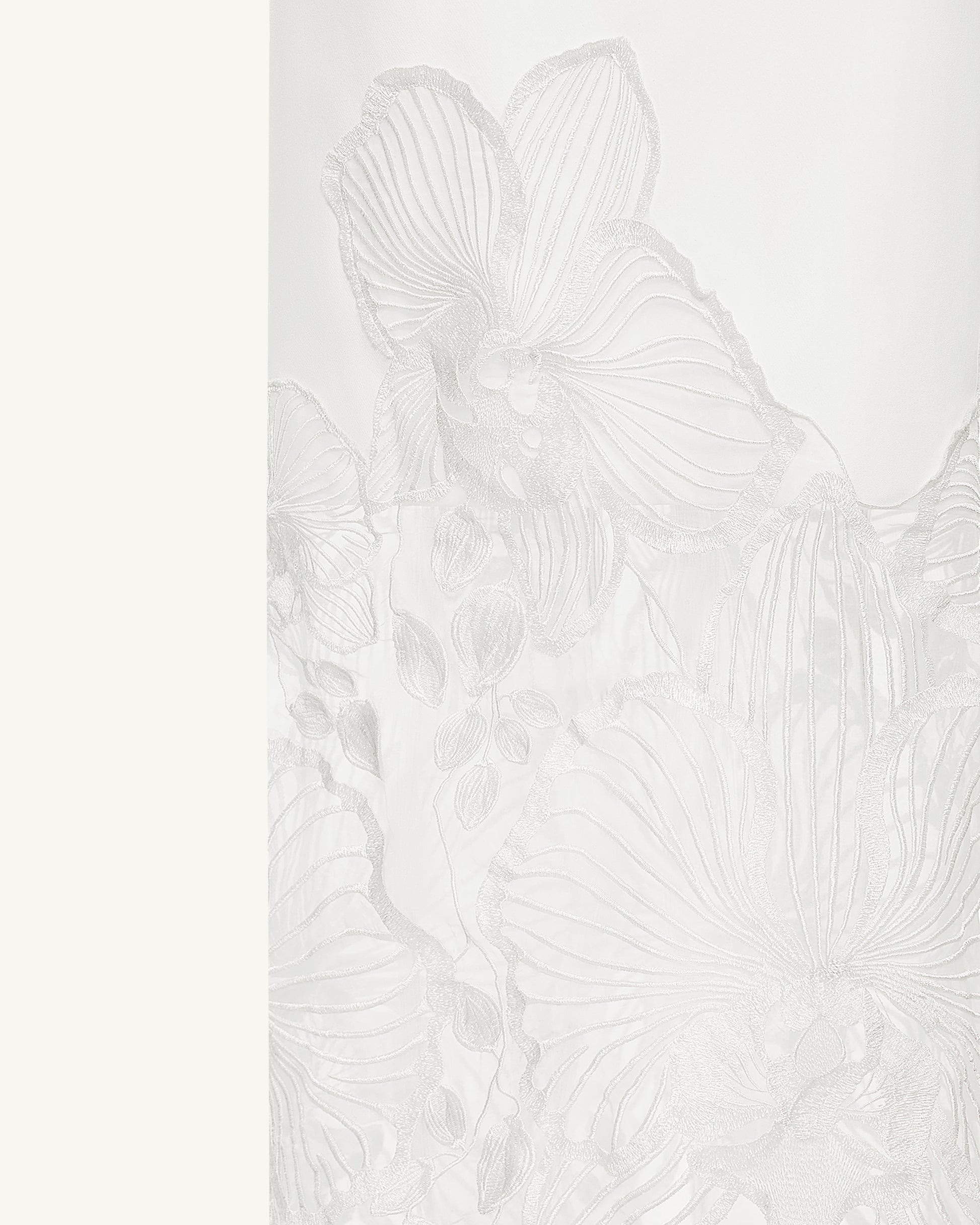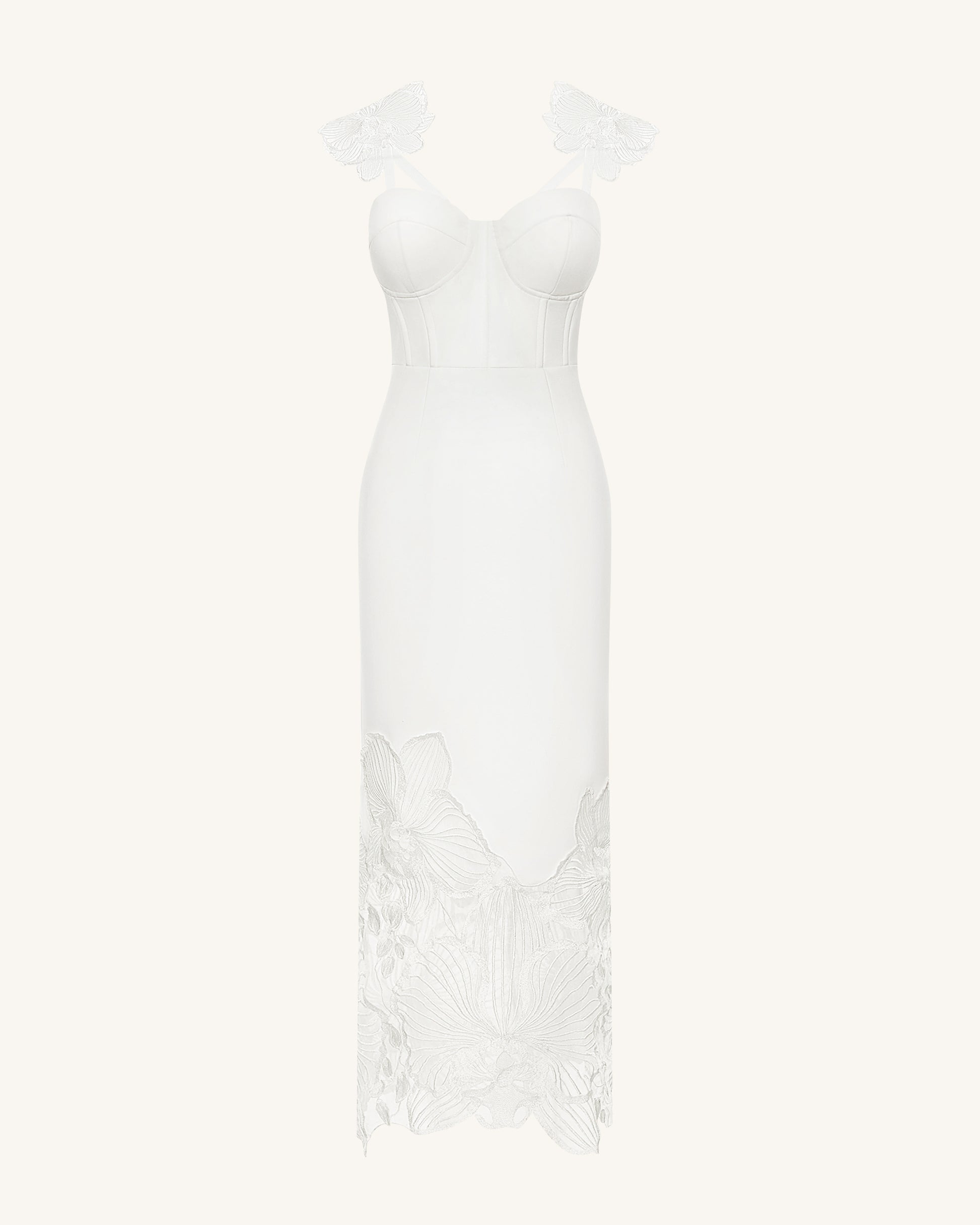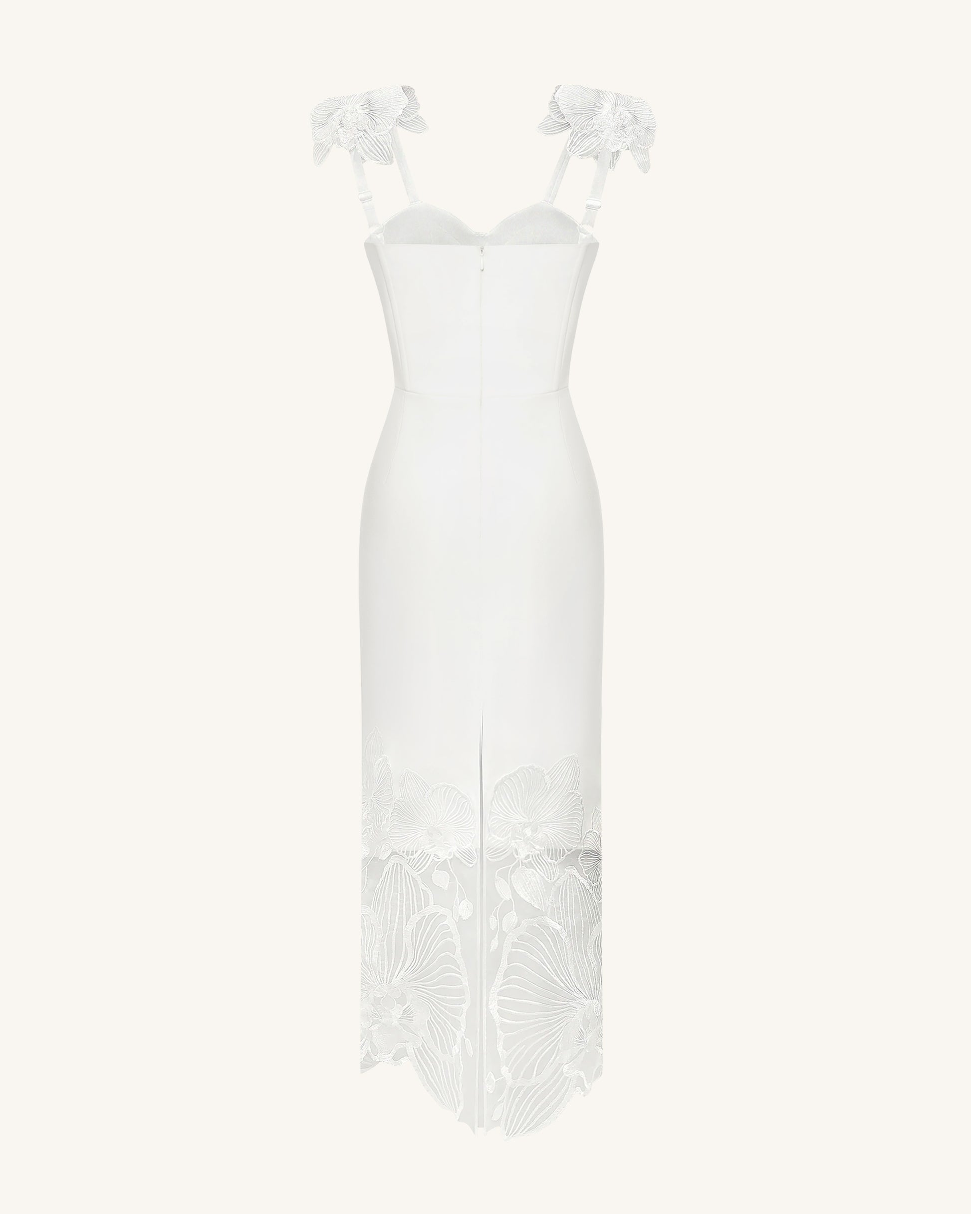 Dieses elegante weiße Midikleid verfügt über strukturierte Korsett-Cups und zarte Schulterträger, die mit 3D-Blumenapplikationen verziert sind. Die taillierte Silhouette betont Ihre Kurven, während der Saum mit filigranen, durchsichtigen Blumenstickereien für zusätzliche Romantik und Textur sorgt. Ein perfektes Stück für Brautveranstaltungen, Gartenpartys oder elegante Abende.