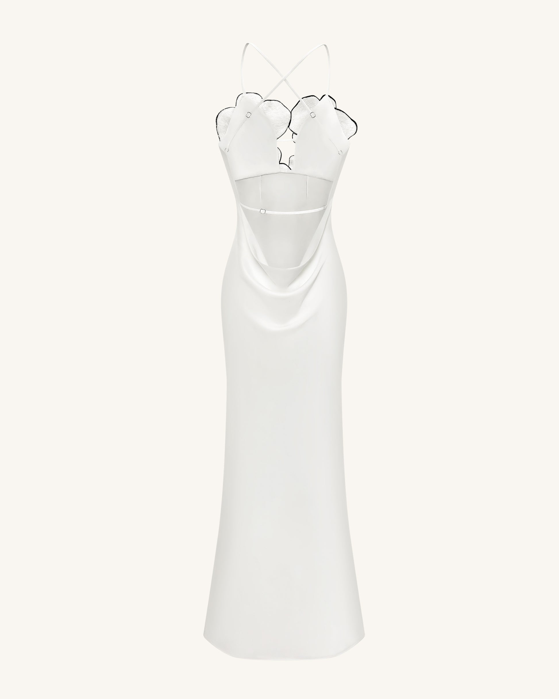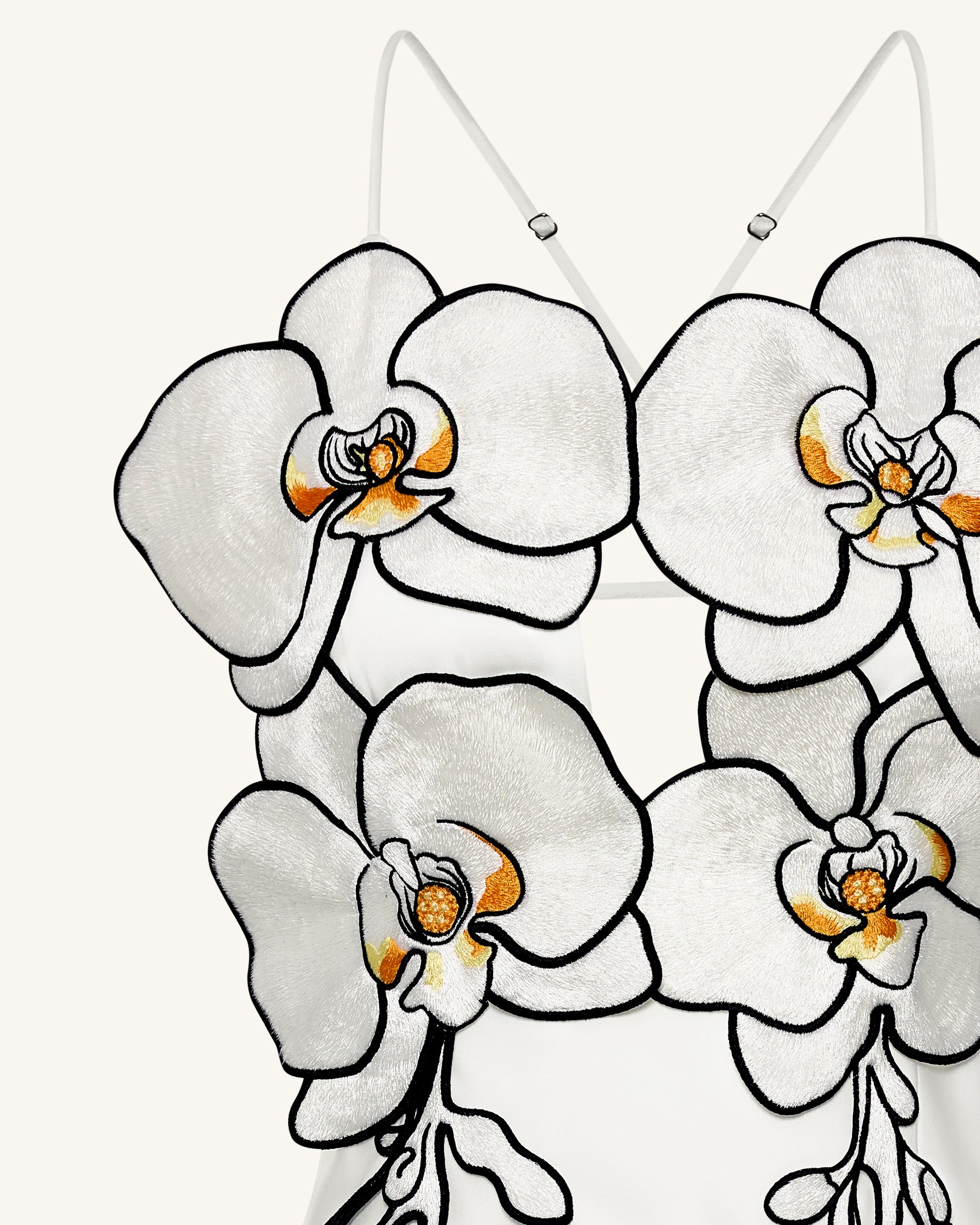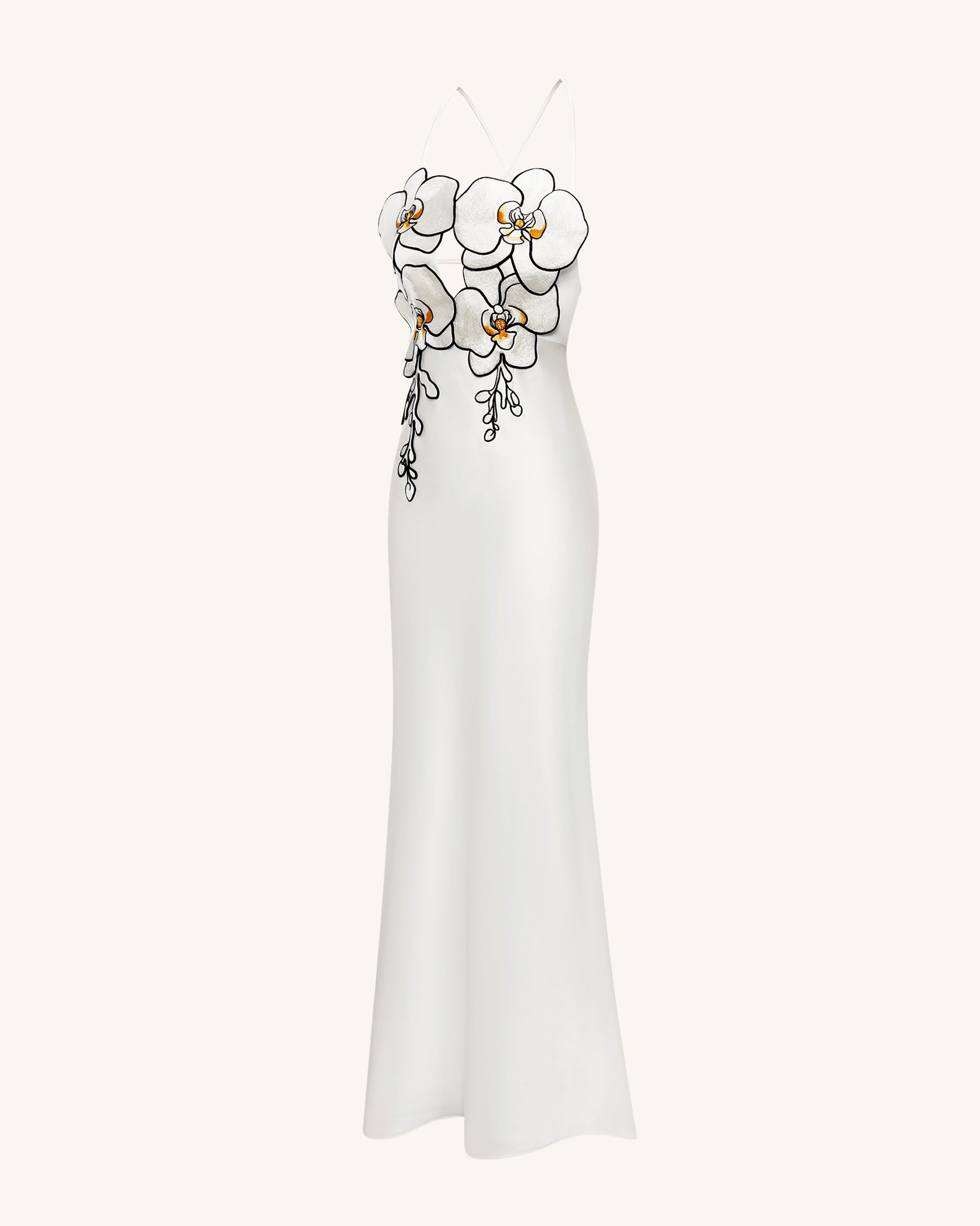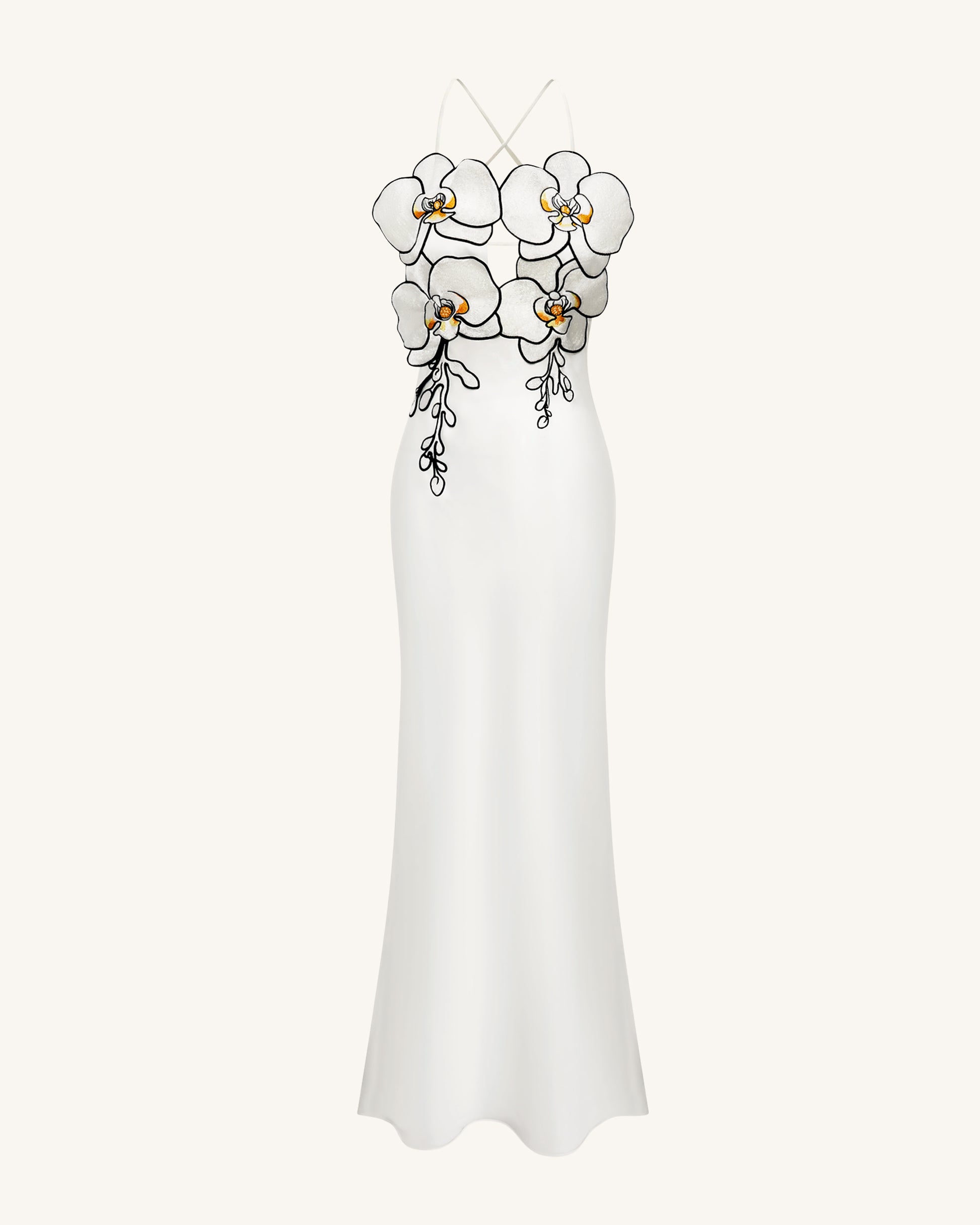 Dieses atemberaubende weiße Abendkleid besticht durch kühne, orchideenförmige Stickereien auf dem Mieder, die einen faszinierenden 3D-Blüteneffekt erzeugen. Die figurbetonte Silhouette und der seitliche Schlitz verleihen eine elegante Note, während der offene Rücken mit gekreuzten Trägern seinen sinnlichen Charme verstärkt. Perfekt für formelle Anlässe, den roten Teppich oder modebewusste Events.