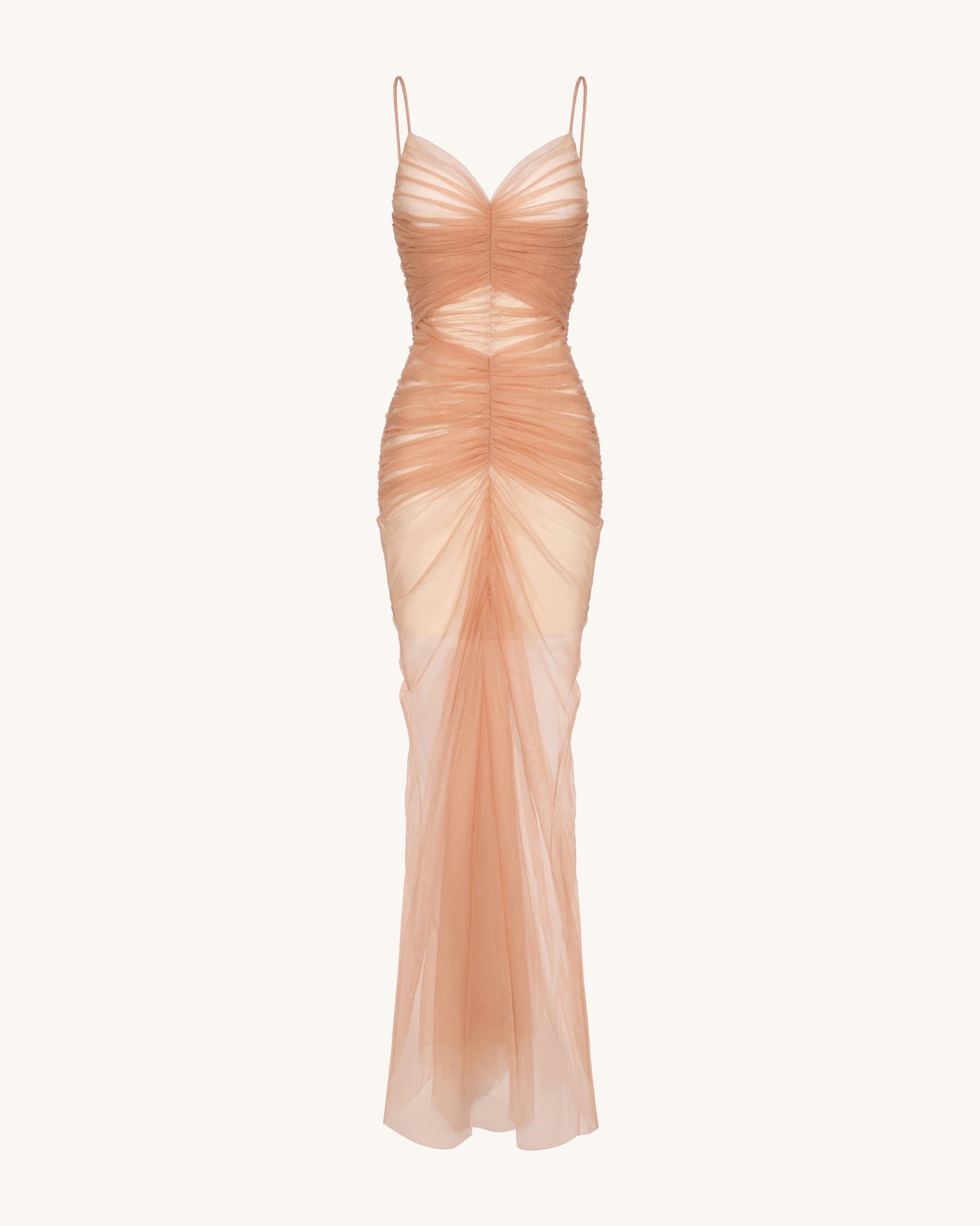 Piper Drapiertes Mesh-Abendkleid - Zimt