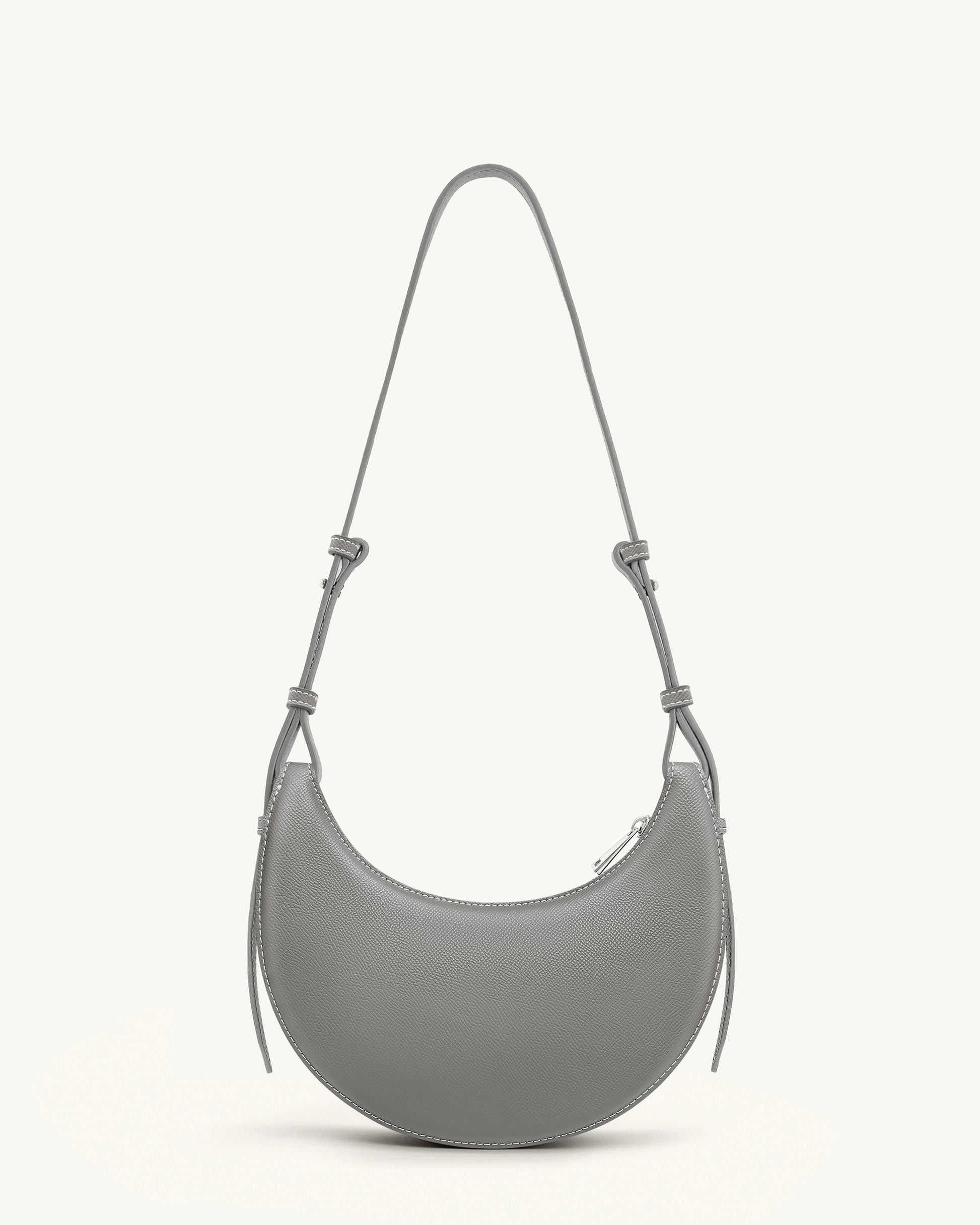 Diese Schultertasche hat eine Halbmond-Silhouette mit texturiertem veganem Leder. Sie verfügt über eine innere Einschubtasche und silberfarbene Hardware. Der verstellbare Riemen ermöglicht ein bequemes Tragen über der Schulter oder als Umhängetasche.