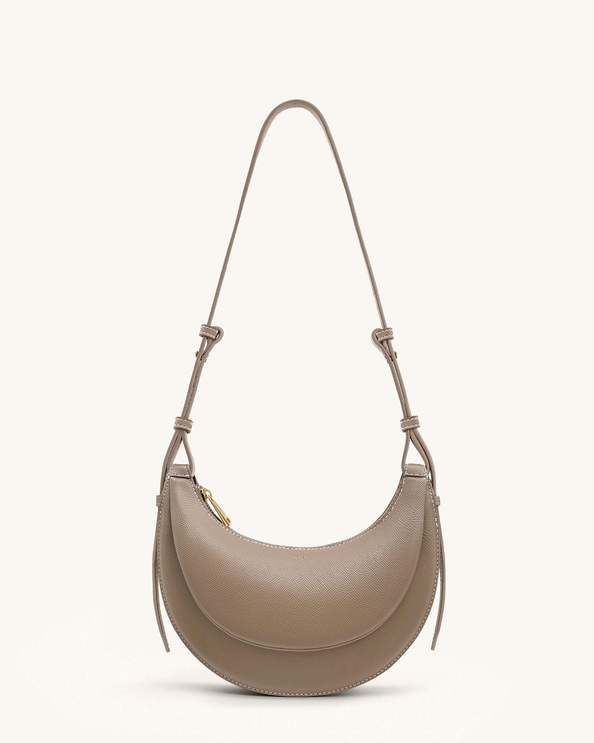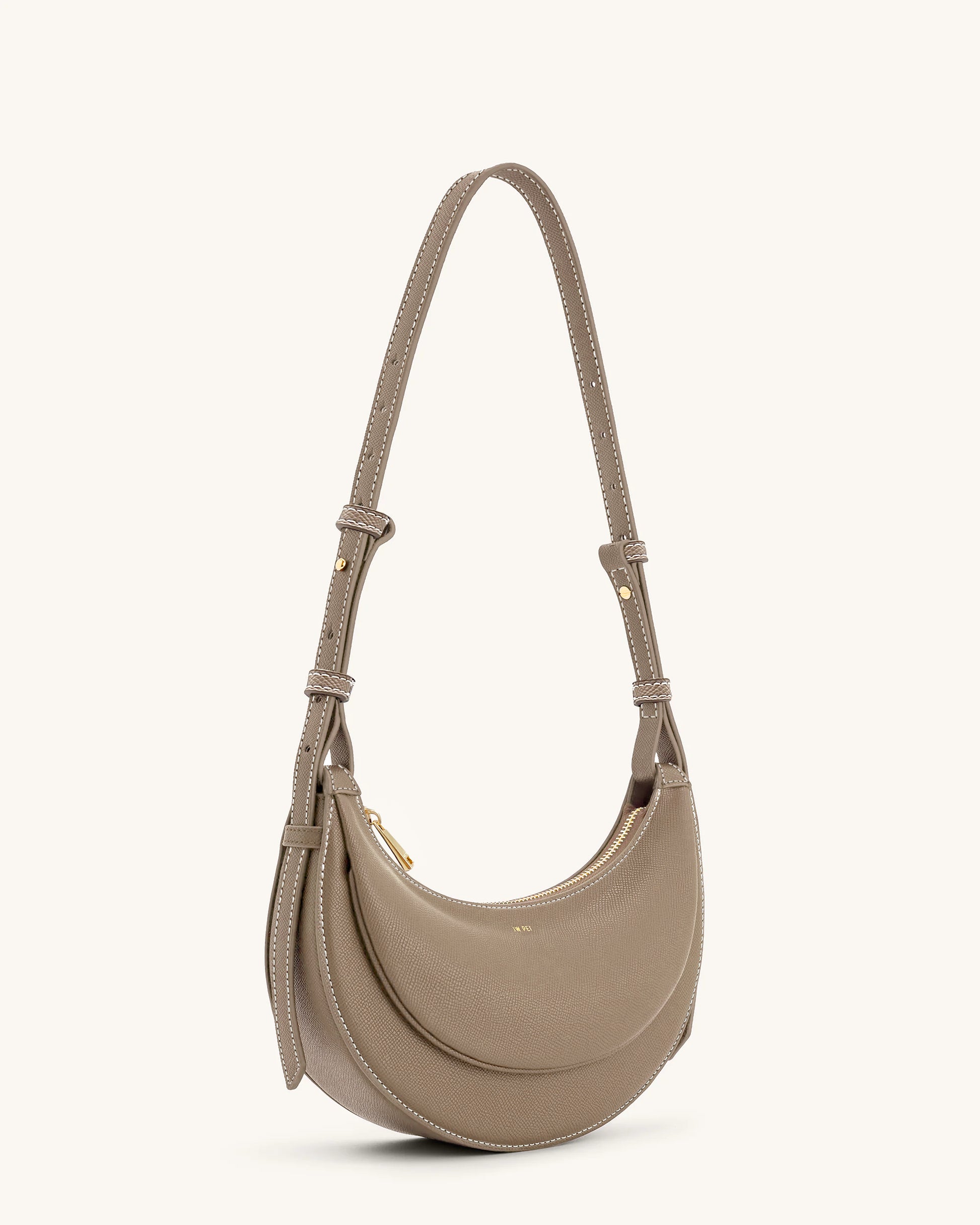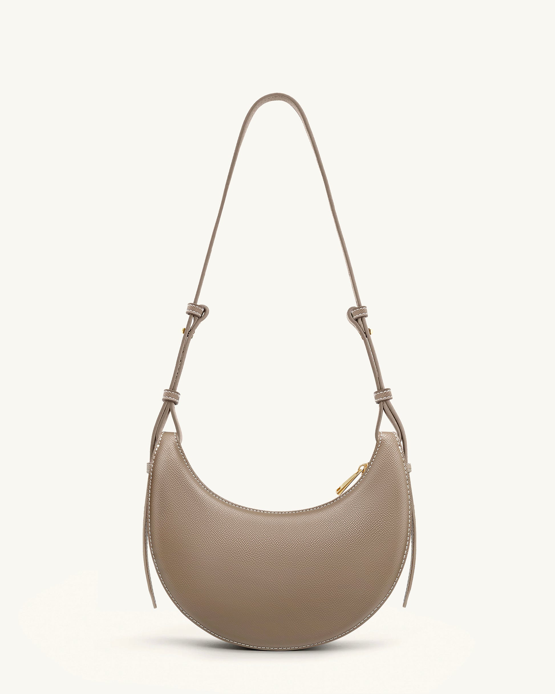 Diese Halbmond-Tasche besteht aus veganem Leder mit einer Palmenkorn-Textur. Sie hat einen goldfarbenen Reißverschluss und einen verstellbaren Riemen. Eine innere Einschubtasche bietet Platz für Essentials. Passend für ein iPhone 16 Pro Max.