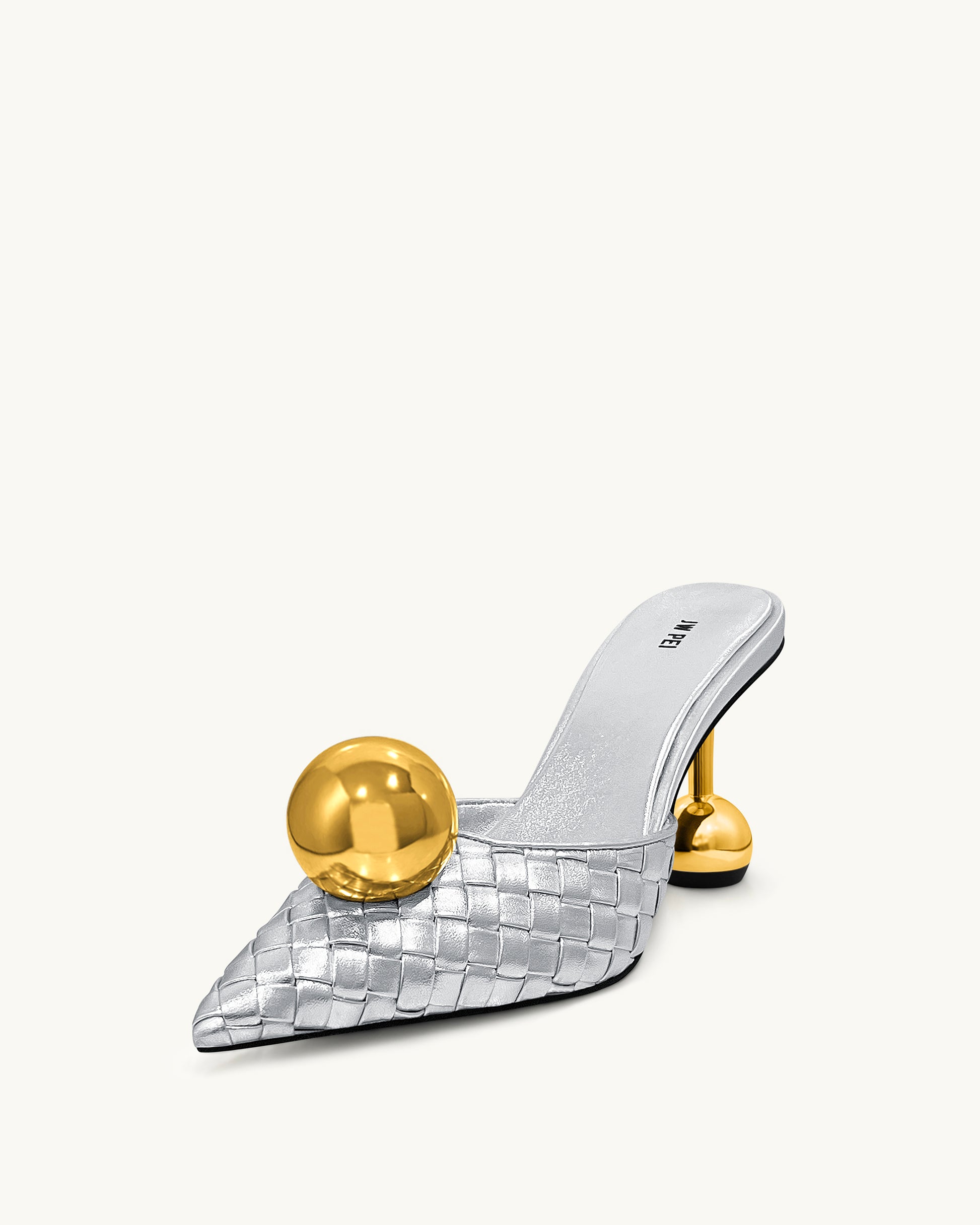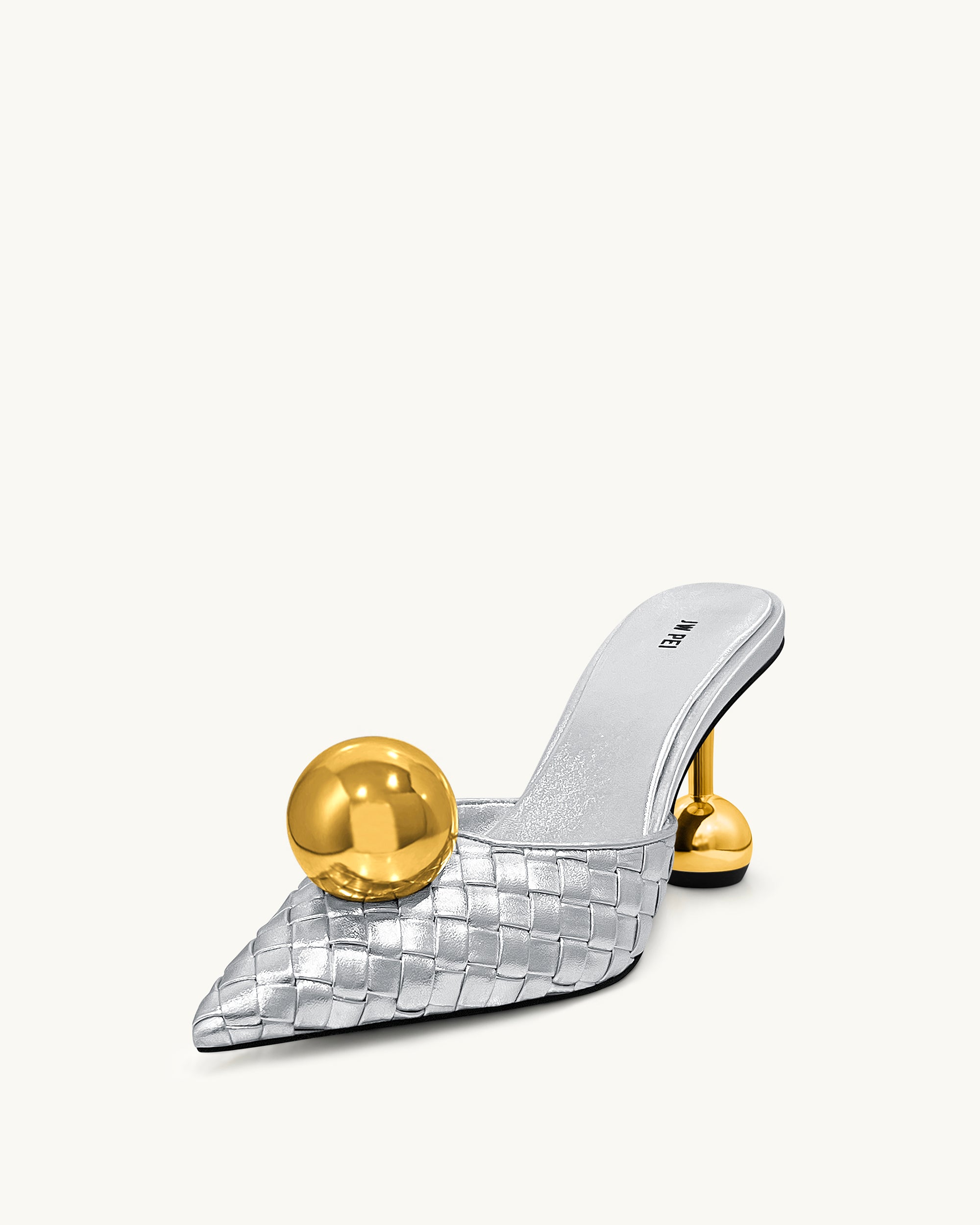 Diese spitz zulaufenden Mules verfügen über ein metallisch silbernes, geflochtenes Obermaterial, das durch einen auffälligen goldfarbenen ovalen Akzent über dem Spann und einen passenden metallischen kugelförmigen Absatz hervorgehoben wird. Das einzigartige Design verbindet modernen Glamour mit raffinierter Eleganz und ist perfekt, um bei jeder Gelegenheit Eindruck zu machen.