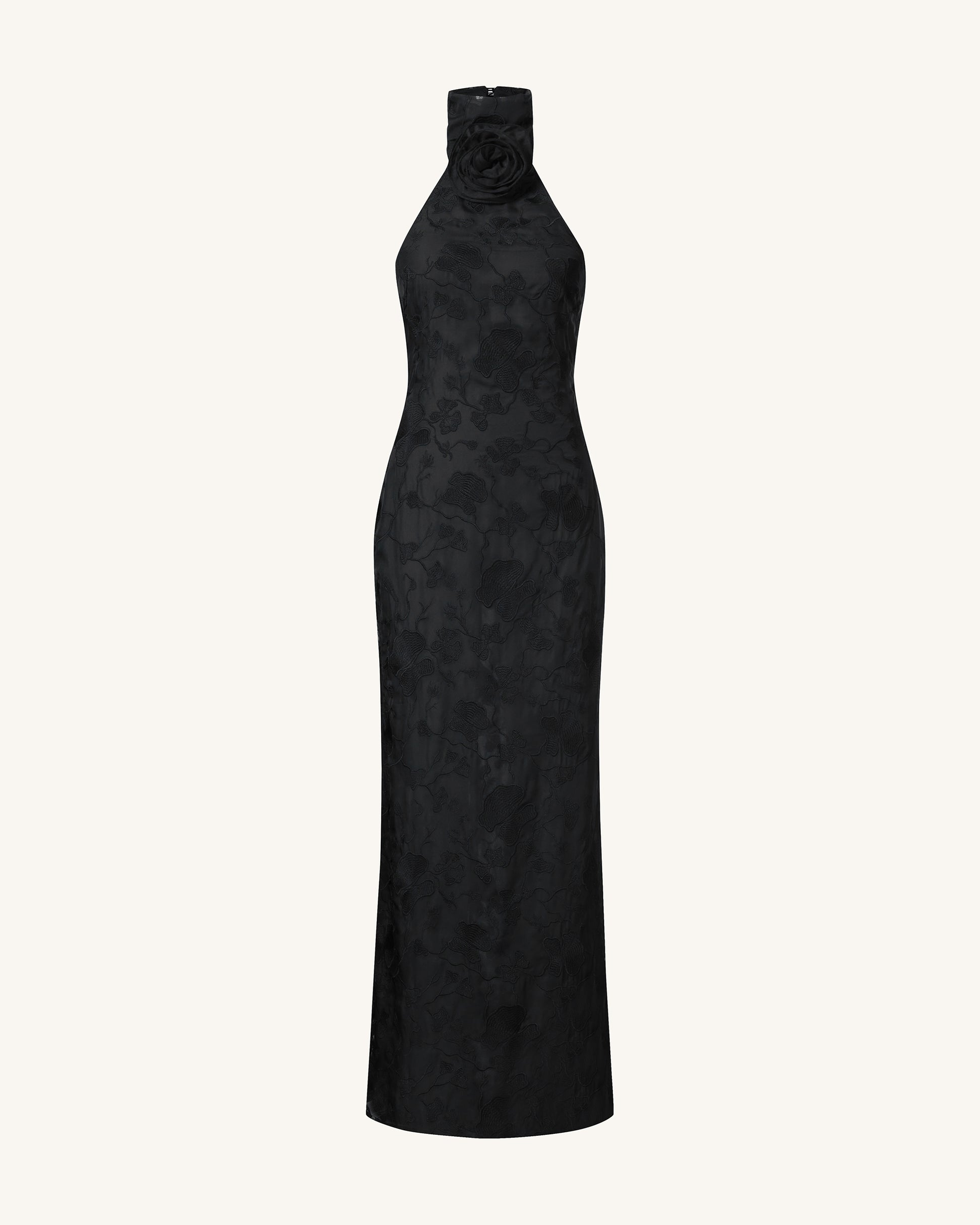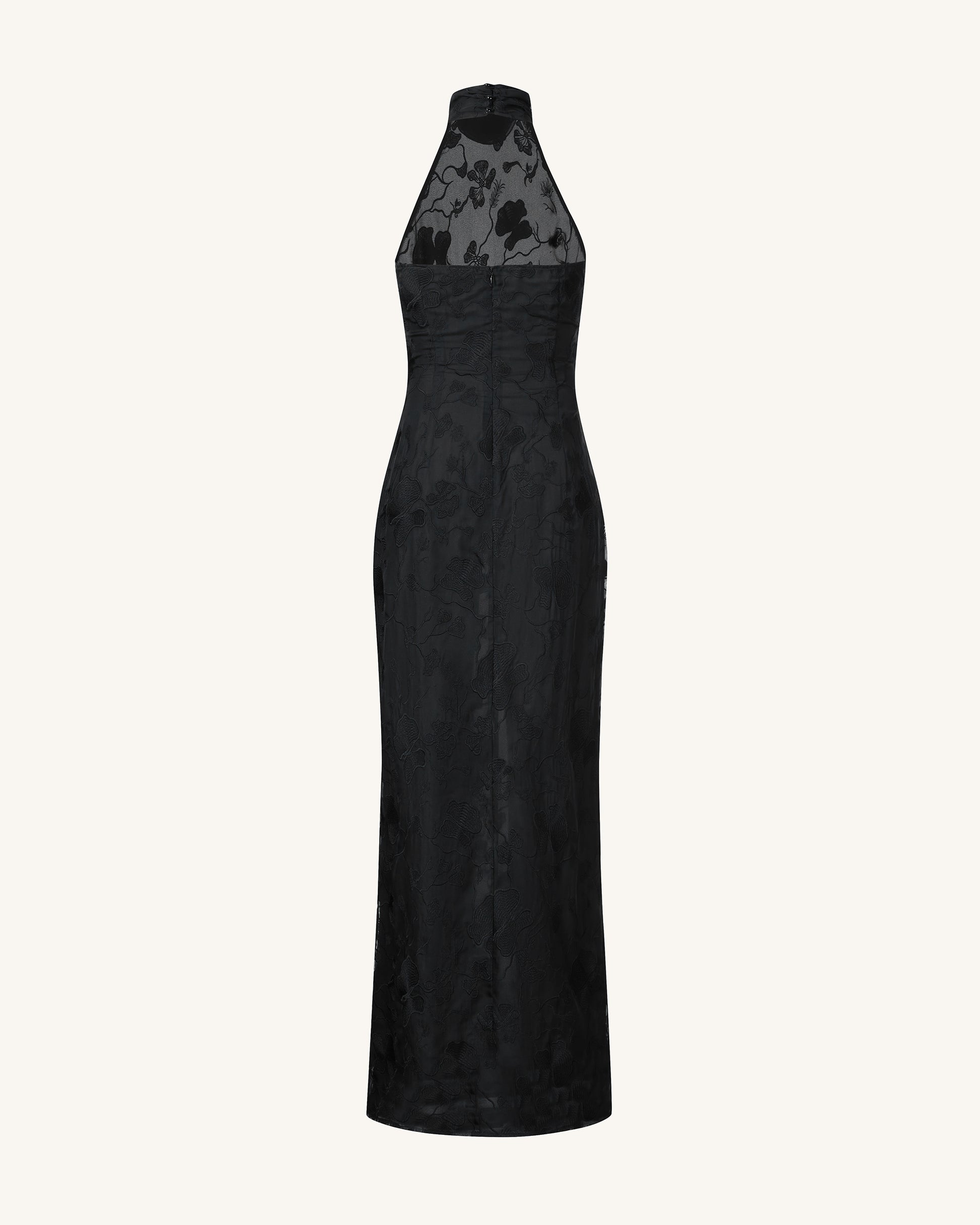 Uliana Schwarzes Maxikleid mit Blumen-Spitzen und Halterneck - Schwarz