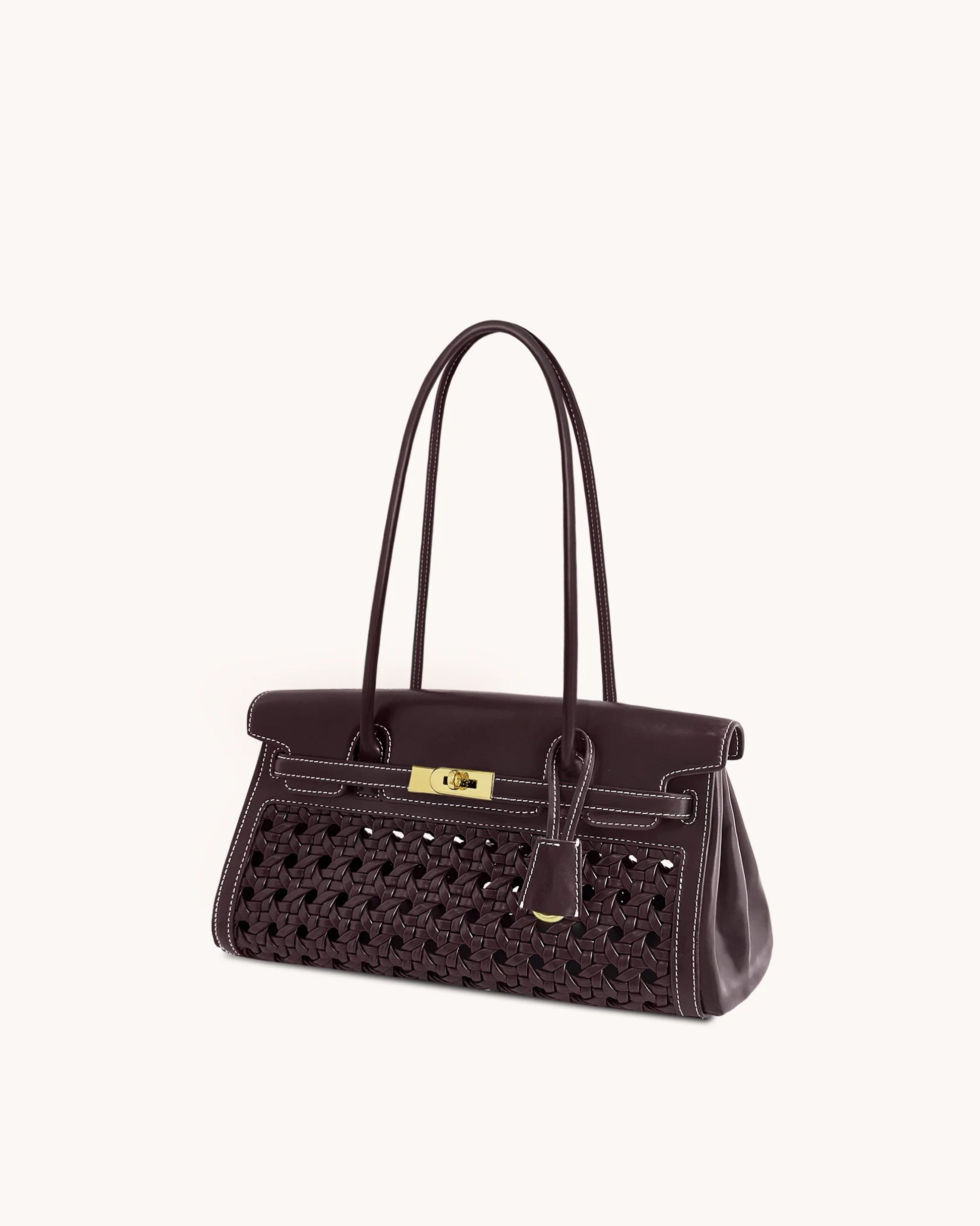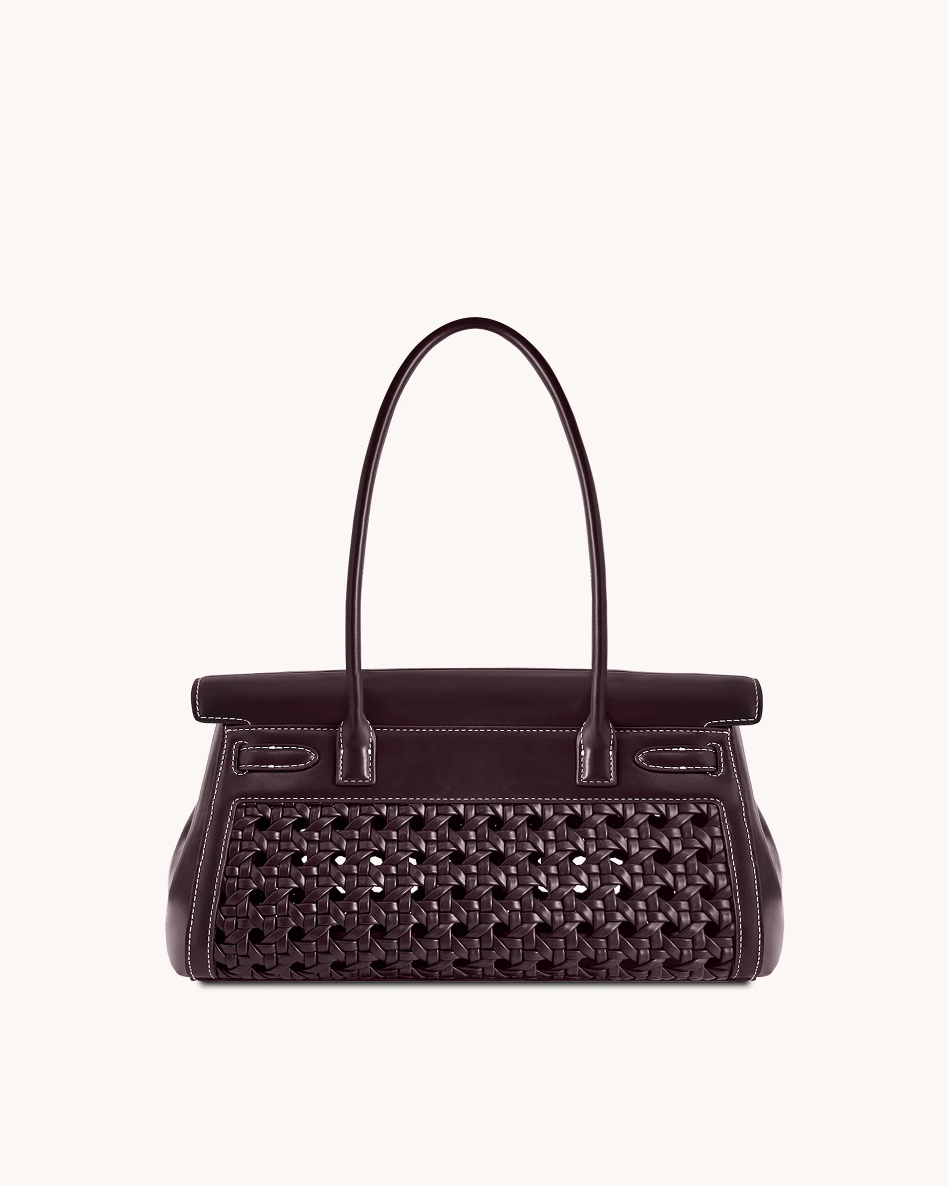 Elegante Tasche mit Handgriff oben und gewebter Vorderseite sowie goldfarbenen Beschlägen. Großzügig, strukturiert und stilvoll – perfekt für den Alltag oder das Büro. Glatte Textur und raffinierter Look machen sie vielseitig und modern.